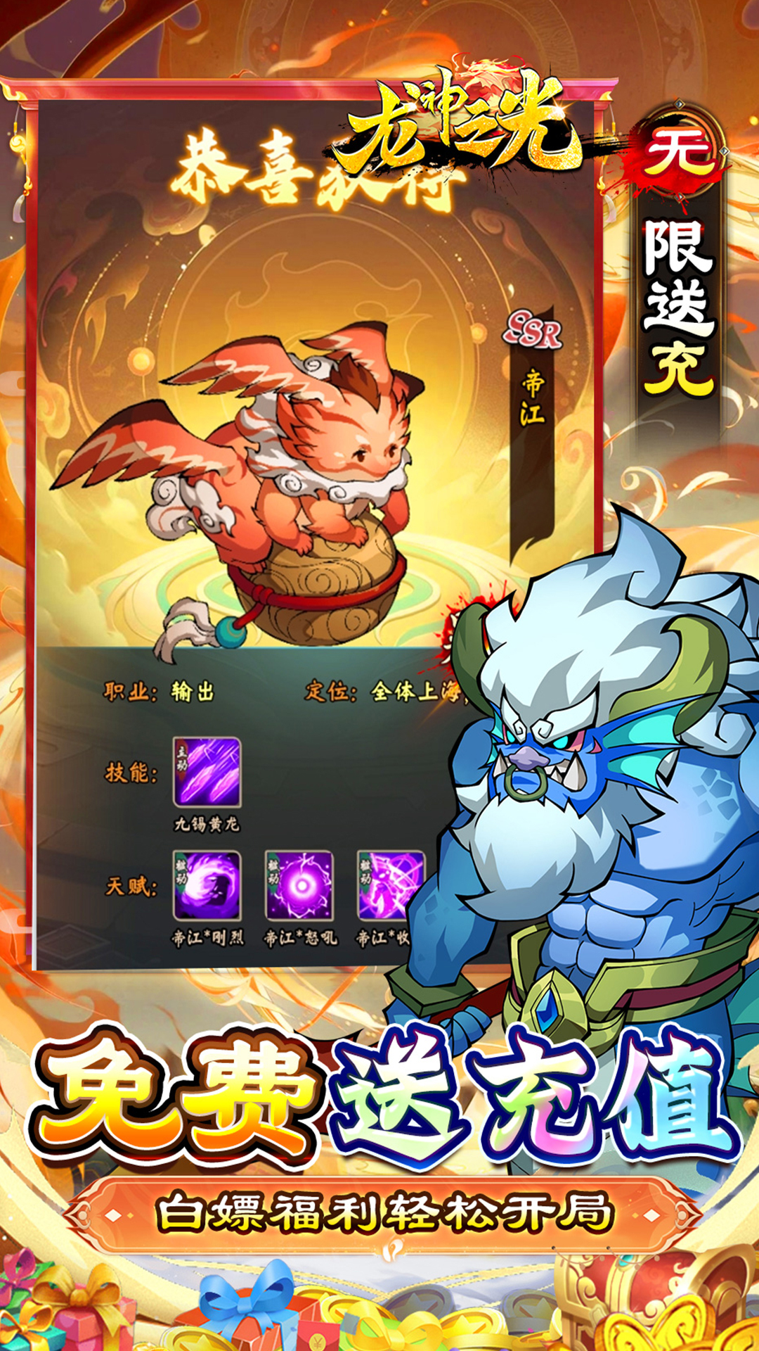 重温经典,共赴山海。《龙神之光》是一款高度还原山海经的咸鱼放置卡牌游戏。游戏中可以收集到众多的奇珍异宝和山海神兽,玩法轻松休闲福利全面升级,每天签到免费领648代金券,还有超多免费充值燃情助力。革新融合多重PVE、PVP玩法和趣味养成路线,全自动托管让游戏变得更为简单,即刻开启全新山海旅程!