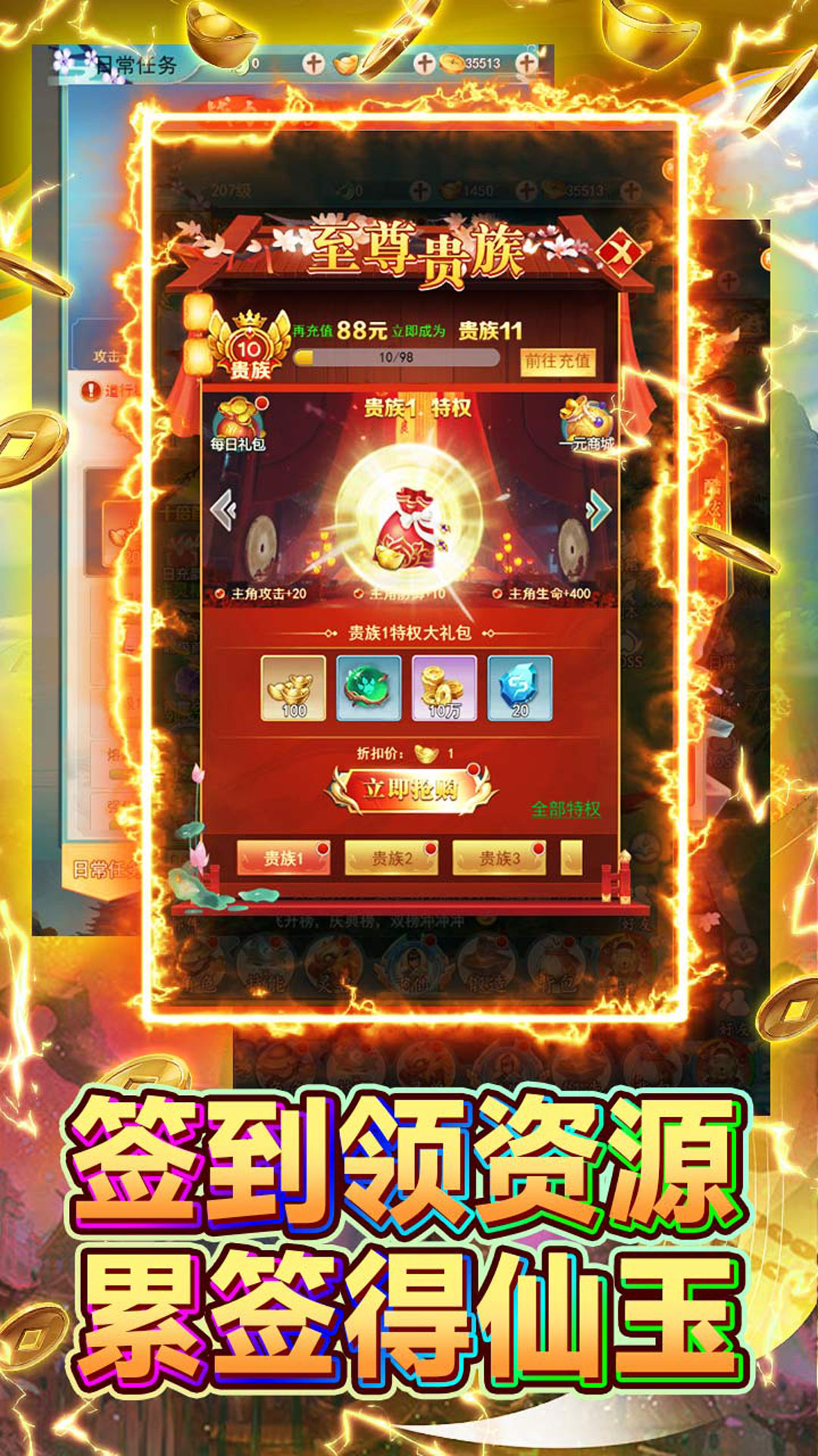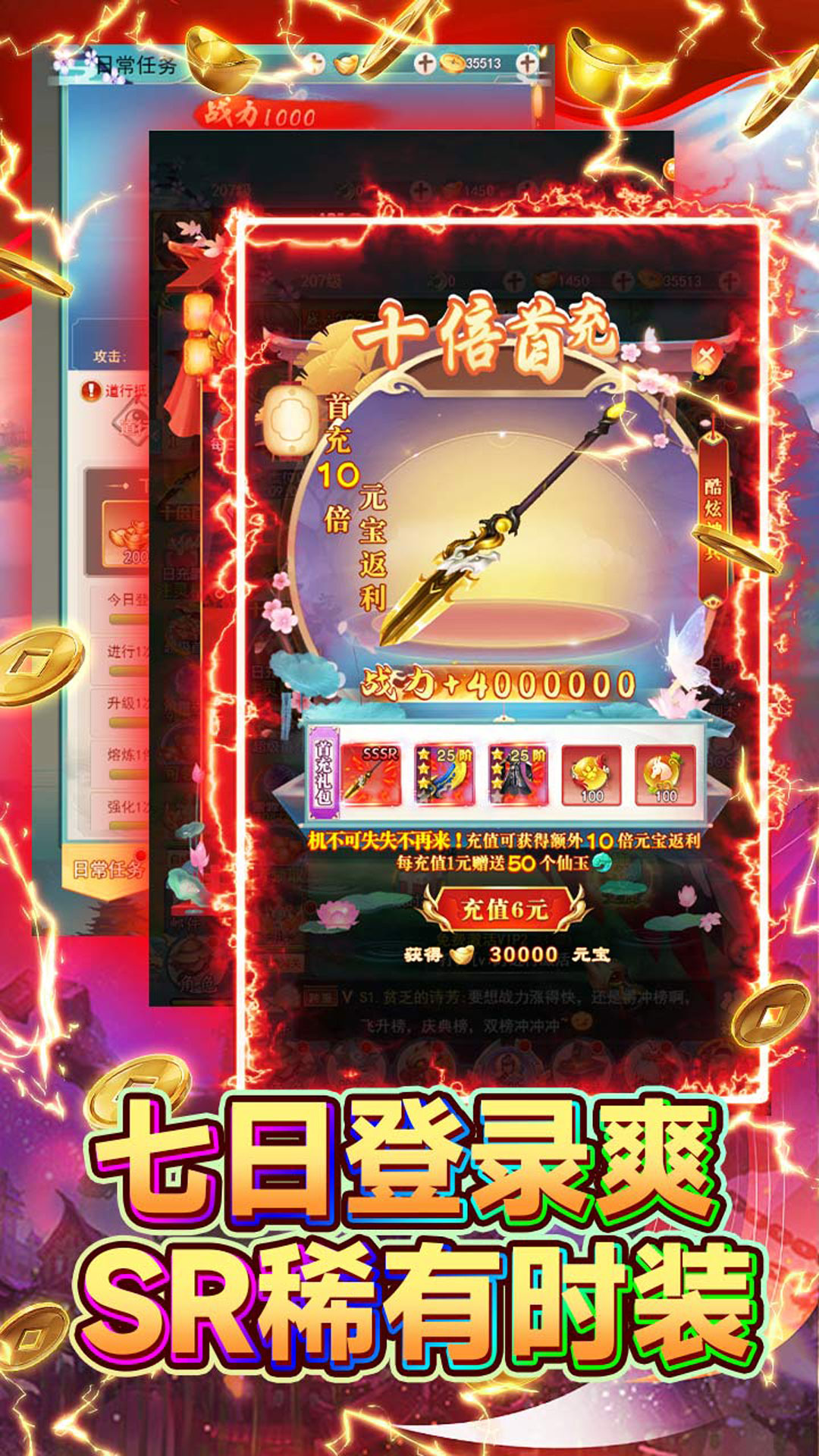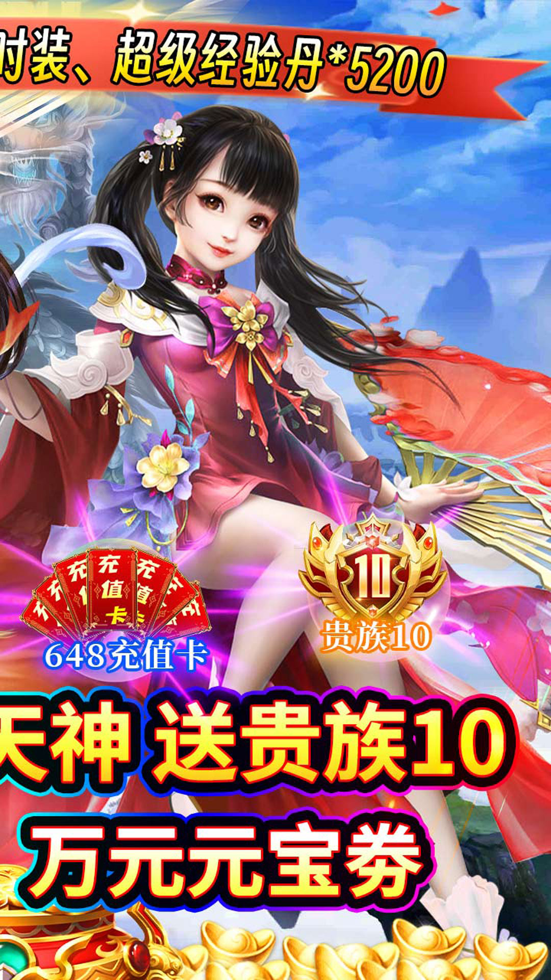 首登赠壕礼:直送贵族10、648元充值卡,SR极品时装、超级经验丹*5200全游0.05折扣 :永久全游0.05折扣,百倍元宝返不停在线取宝令:在线领取神兵、灵器令牌,共计上百抽七天狂欢礼:开服前七天完成任务领取仙骑*烈焰凤凰七日送福利:前七日登录可领取大量材料,第七日直领SSR极品时装累签领仙玉:每日签到可领取不同的道具材料,累签规定天数还可领取仙玉