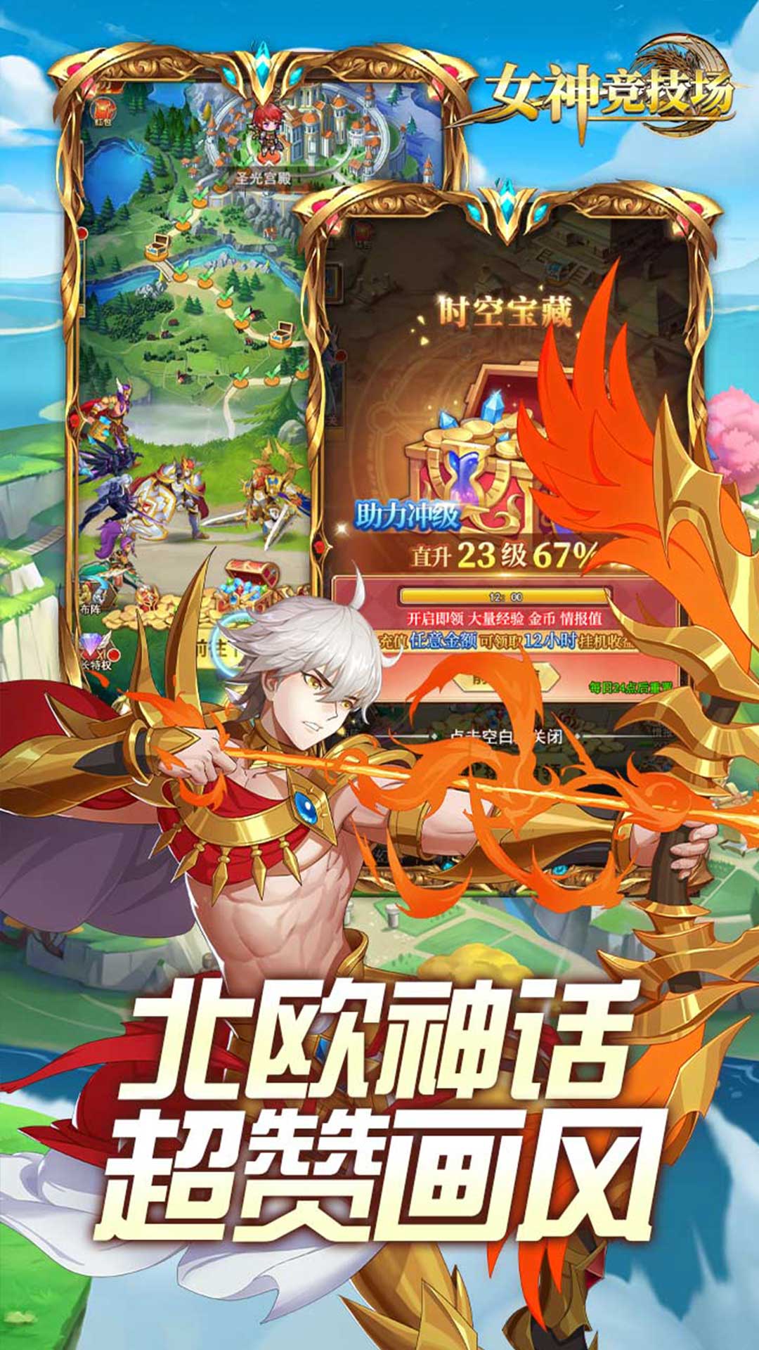 《女神竞技场》是一款放置卡牌类游戏产品,游戏题材选自欧洲三大神话体系,游戏故事以史诗神话为背景。玩家化身异界少年,穿越时空,置身于神话时代,通过召唤雅典娜女神、奥丁、宙斯神王等上百位神话神明,与他们并肩作战,在冒险的路上不断收获惊喜和成长,获得自身战斗力、装备的提升,找回失落神器,重塑神域!