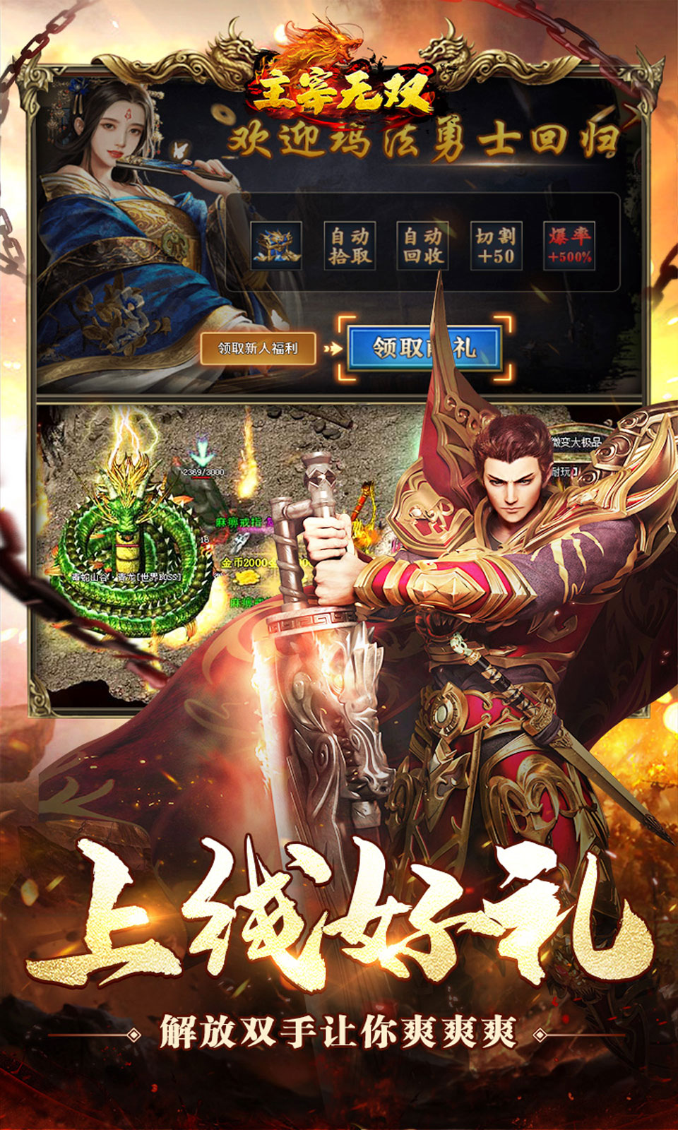 1、上线豪礼解放双手爽玩全局!2、刷怪获取实物,回收得货币!3、怪物图鉴不容错过的超值奖励!4、经典三职业合击,上线就是干!