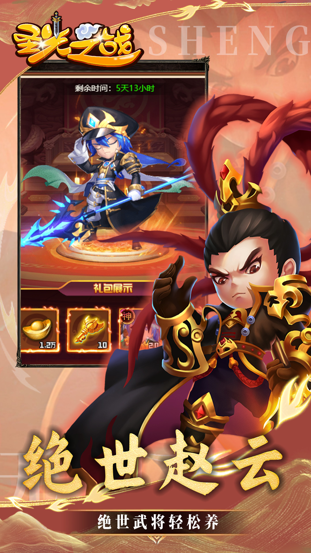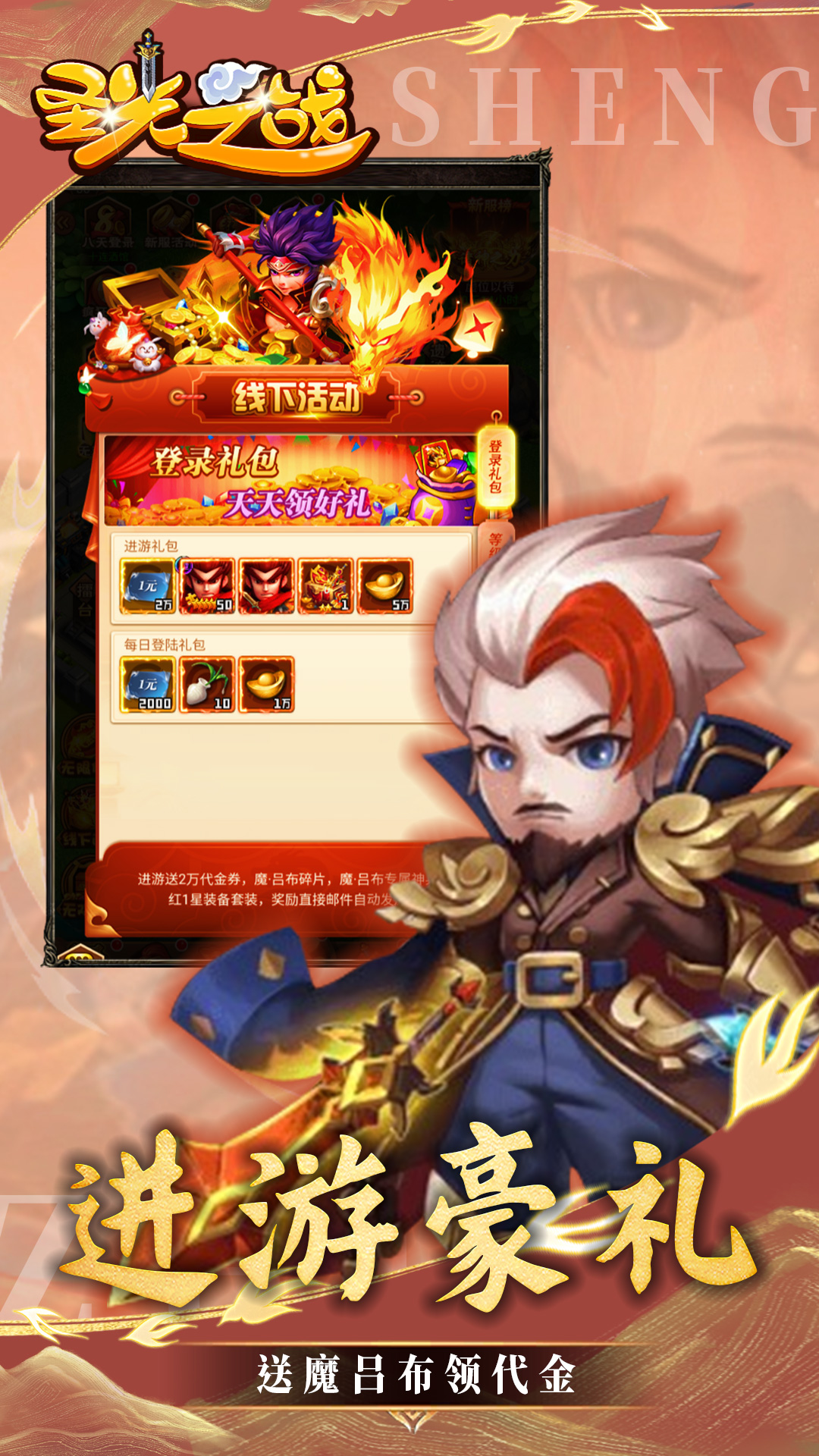 《圣光之战》是一款全新三国卡牌挂机版,减少手动操作,更多的时间让主公去思考策略与布局。超炫萌系画风,结合卡牌体系,使玩家亲临其境,将各路三国英雄收入麾下,一统三国。游戏开局直接送一套GM装备,升级再领万元红包,还有每天完成任务皆能领取红包,福利爆满,游戏简单容易上手,轻松滑动指尖,放置挂机养成,给您不一样的游戏体验!