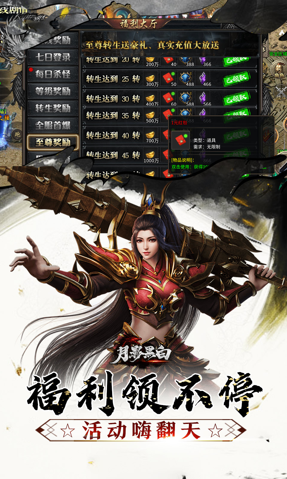千件专属,大量神器,众多玩法,更有诸多福利(巨额货币,爆仓材料,绝版称号,神级技能)领到手发软!开区直接拿下一起绝尘,直接弹射起步,大量材料,切割,一键传送与双倍战功,激活专属天命之子,众多福利领取,从此开启通关之力!新人上线跟着主线任务走,免费领取唯一赞助与首充,前期优先升级切割属性与爆率,完成剧情任务,获取丰厚奖励与称号!本服所有怪物、活动、任务都爆红包,红包等于一切!可领取大量福利奖励!!!后续千件专属,大量神器,诸多玩法,请各位玩家自行探索!
