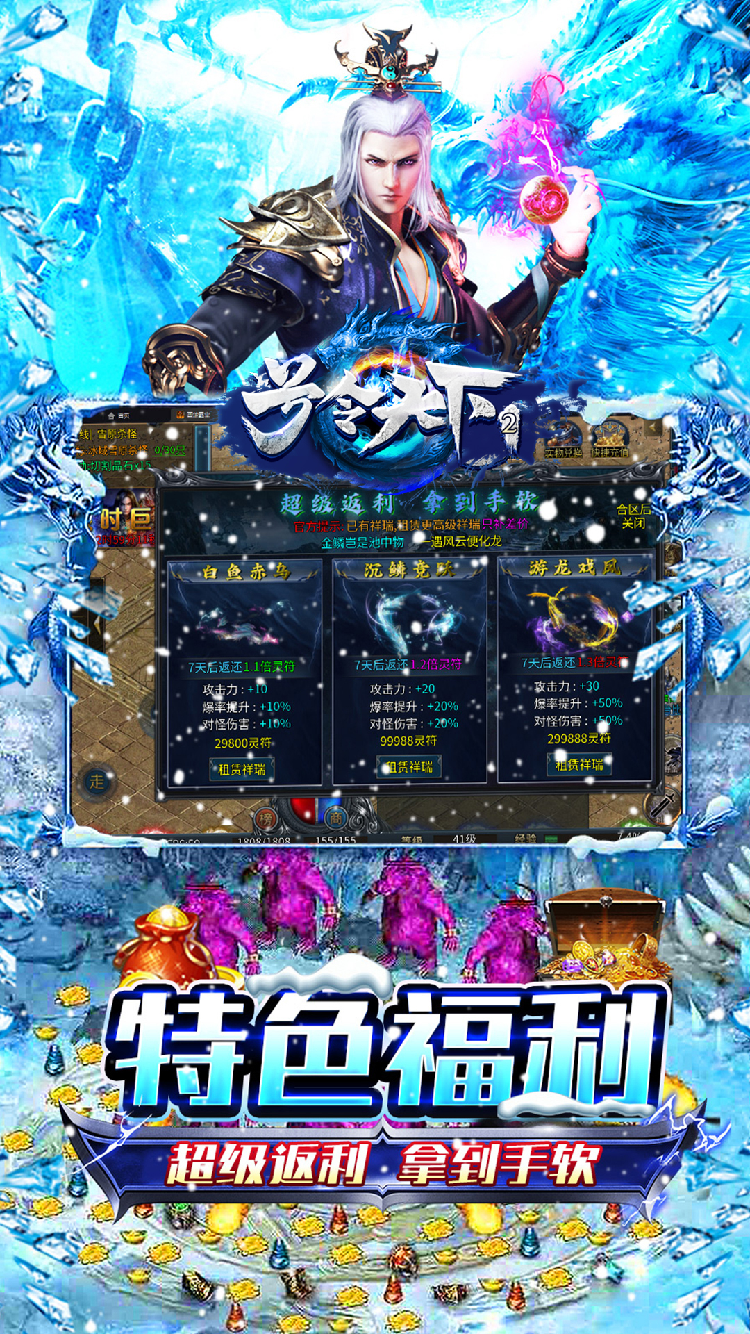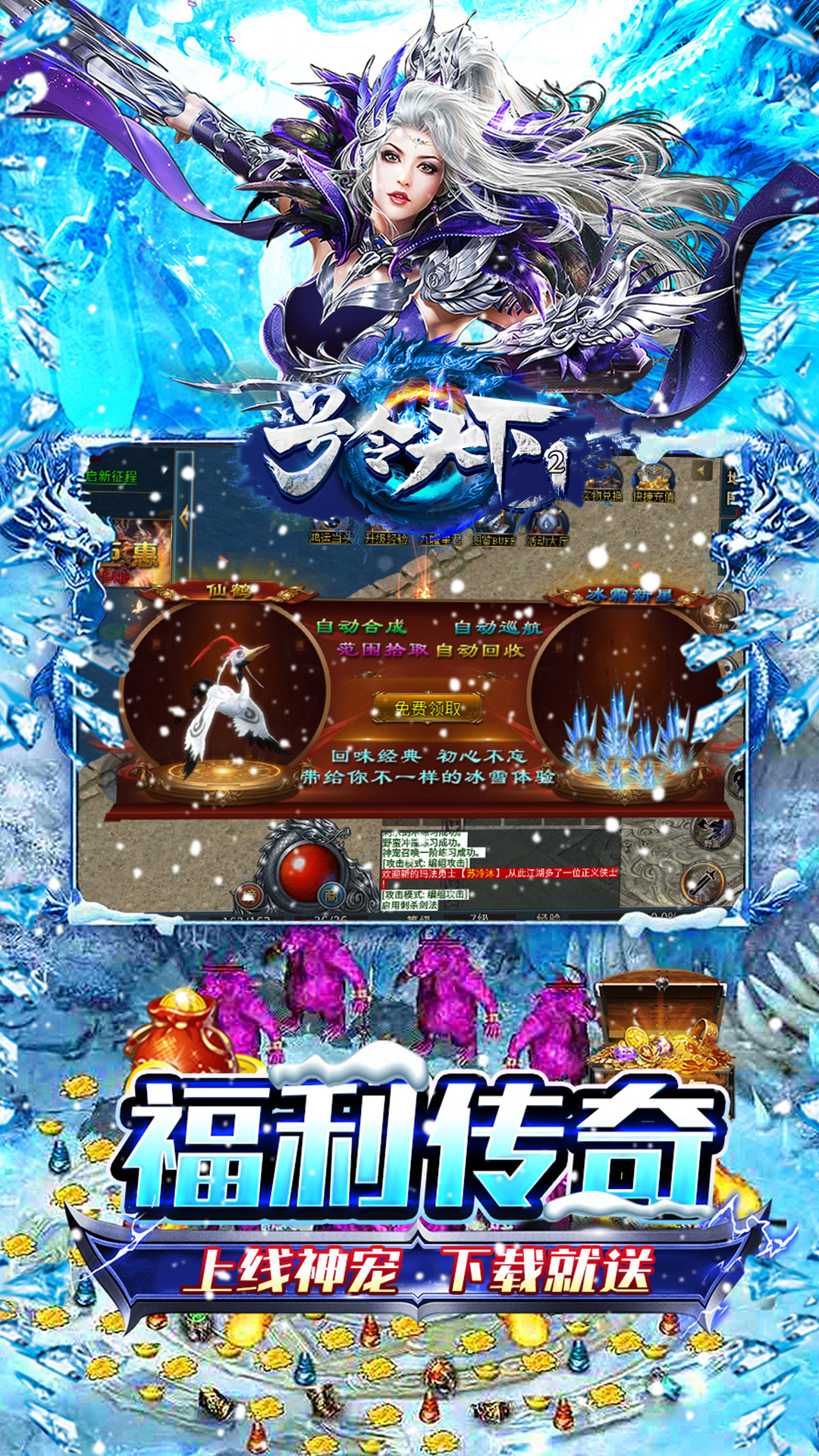 《号令天下2(大哥冰雪传奇)》是一款超爽的原味冰雪传奇!上线送灵龙,送自动回收,自动拾取!在线送大礼,等级奖神装,奖励领不停!刀刀切割,灵宠群秒超爽打怪,炫酷技能!