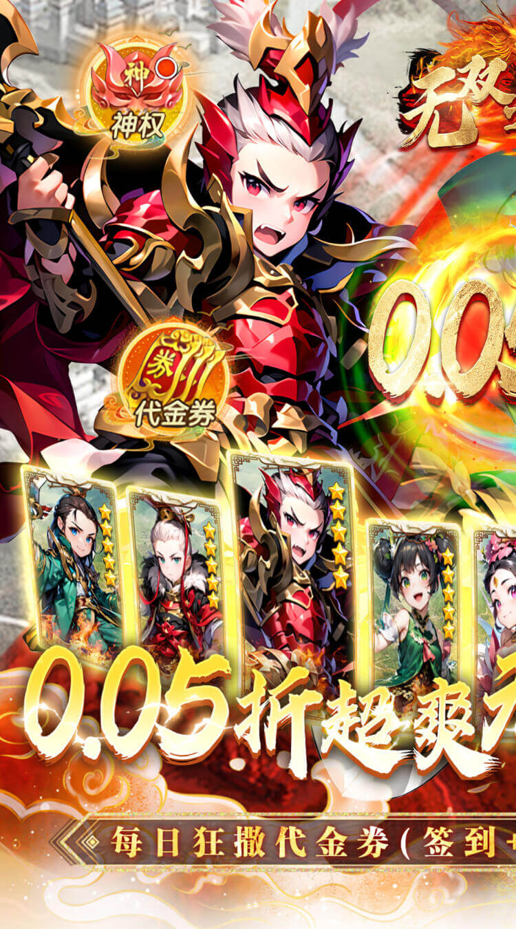 《无双之王》,0.05 折解锁 GM 神权,签到送 500 代金券,每日兑 1500 代金券,买断 GM 权每日领上万代金券,零氪爽玩!?颠覆传统三国剧情,巾帼英雄激战沙场;创新回合制玩法,指尖排兵布阵,烧脑博弈。无需复杂操作,轻松体验争霸快感。速来执掌神权,改写三国传奇!