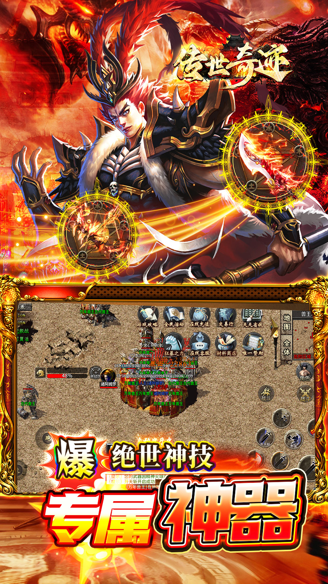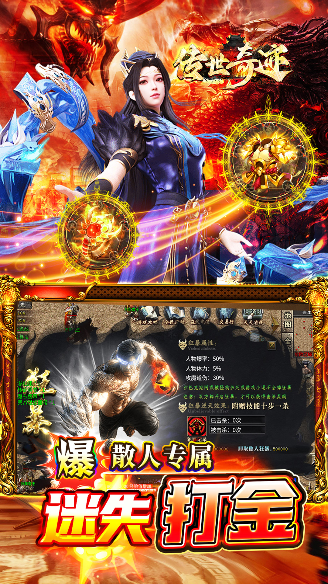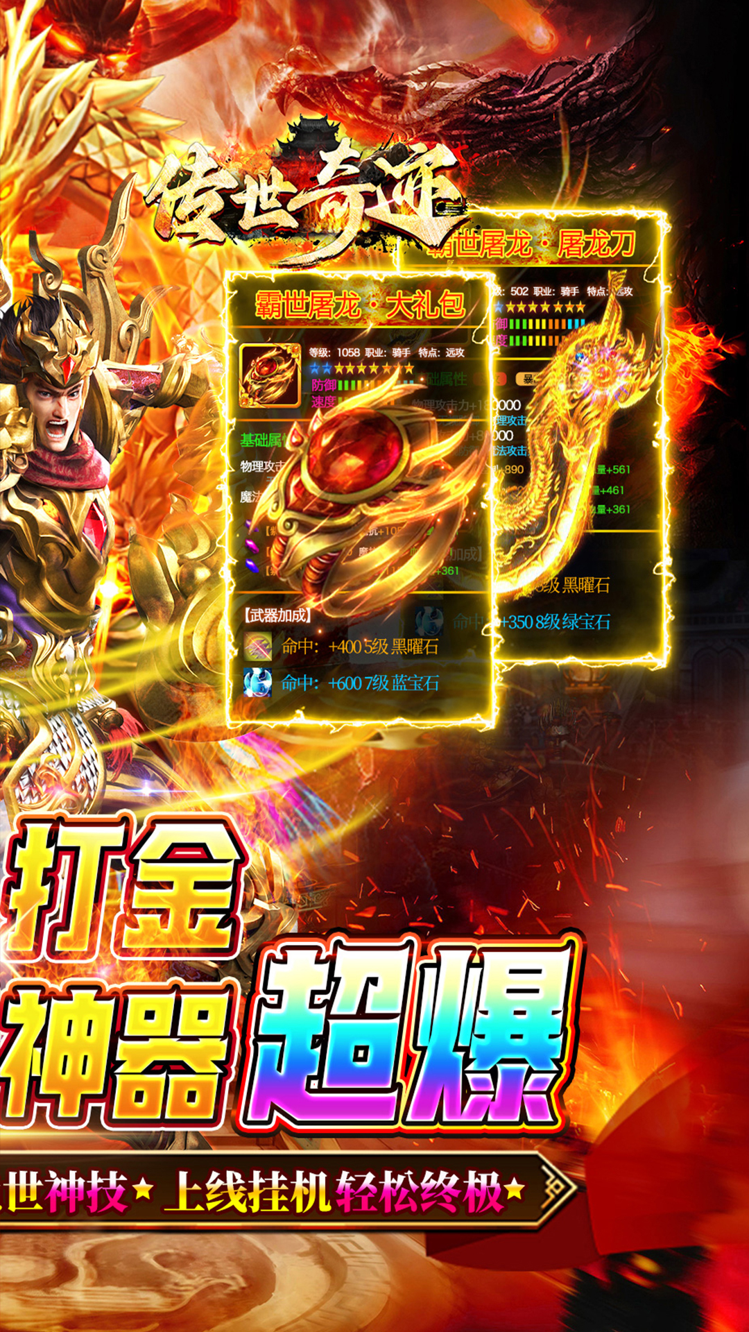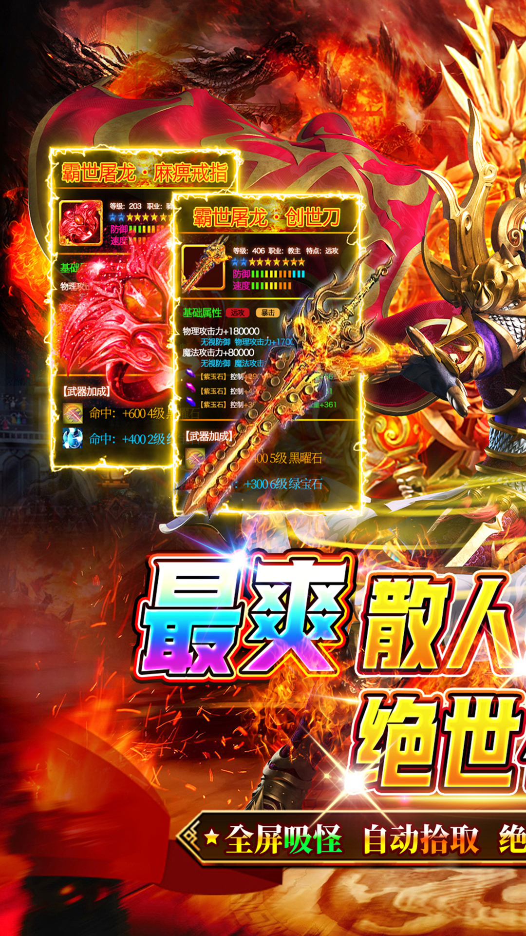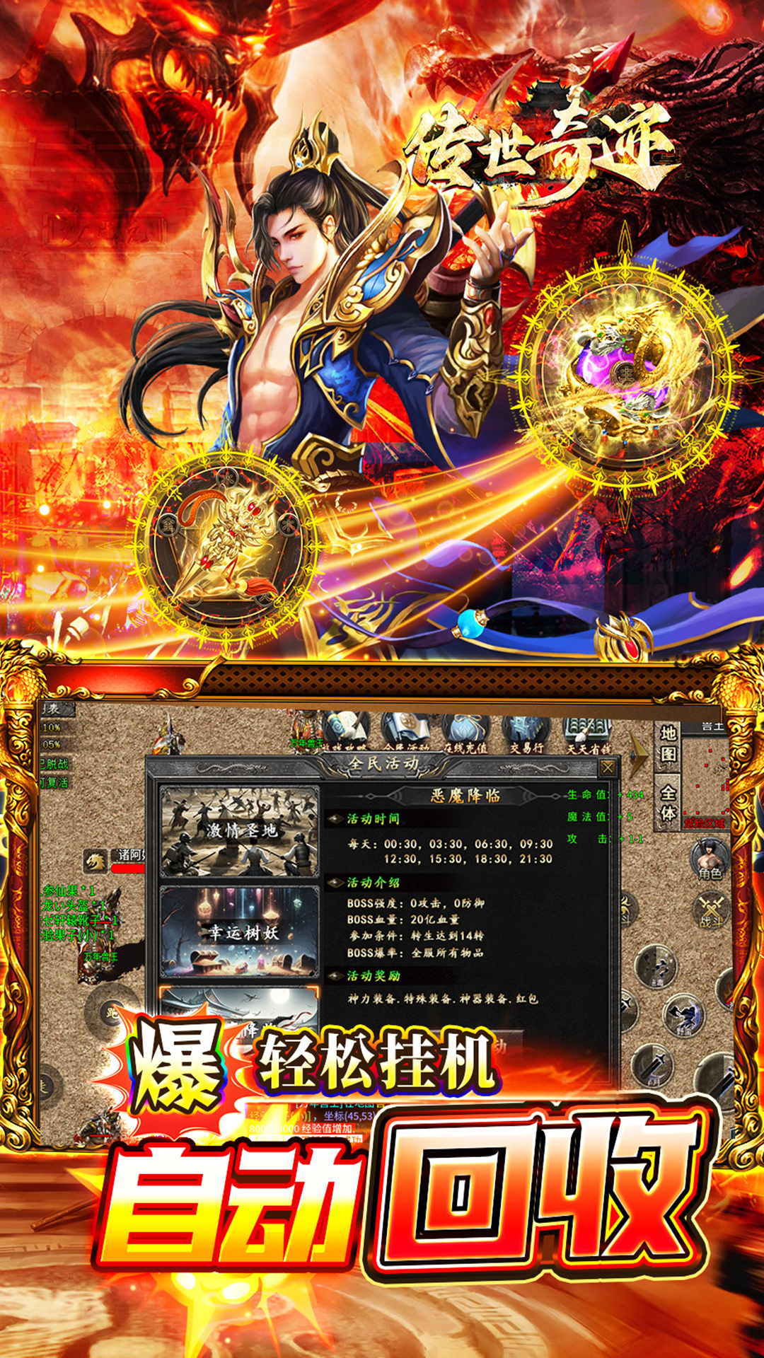 ★上线豪礼,自动回收、自动拾取、满仓库、满背包!!★打怪爆充值红包,材料、装备全靠打!!★长久耐玩,简单不复杂,最强看脸!!★无累充、无隐藏消费,唯一赞助打全场!!