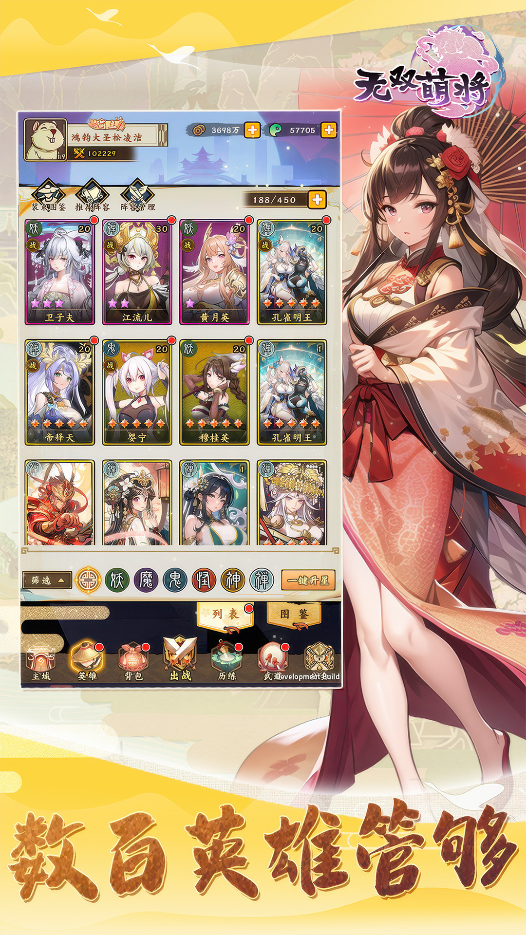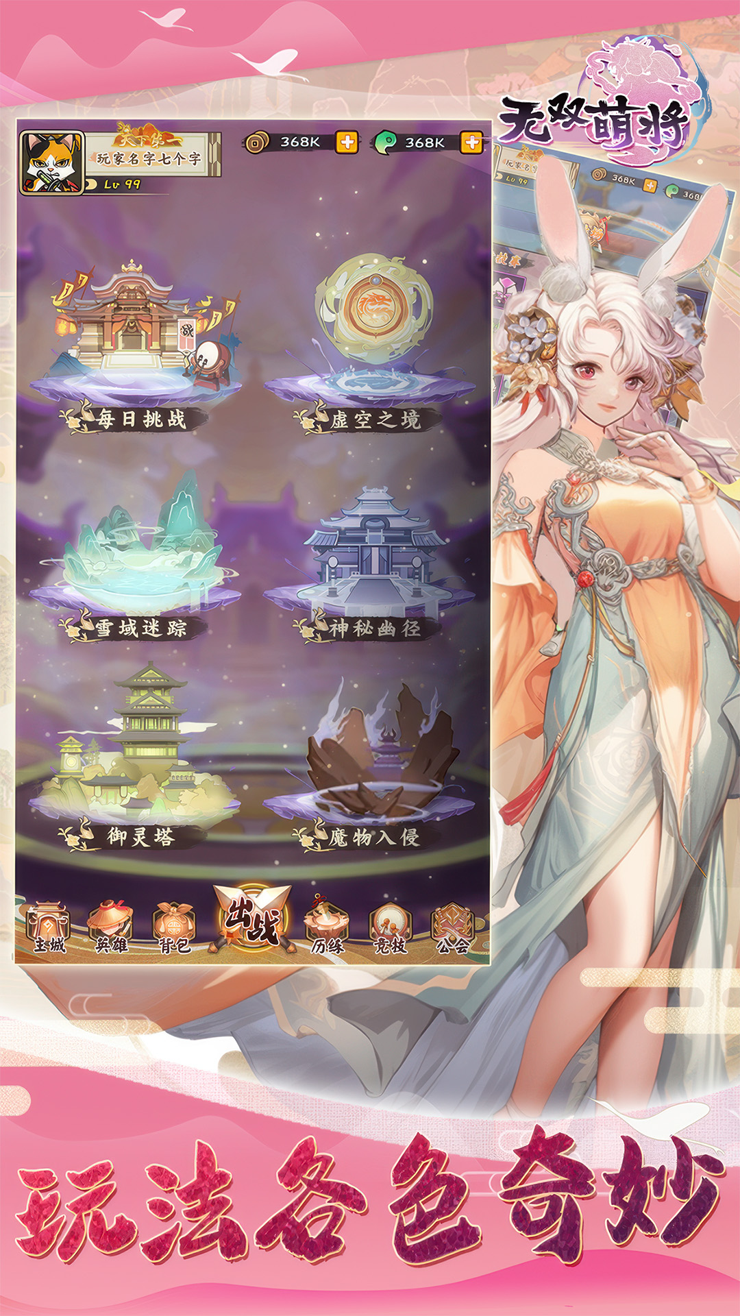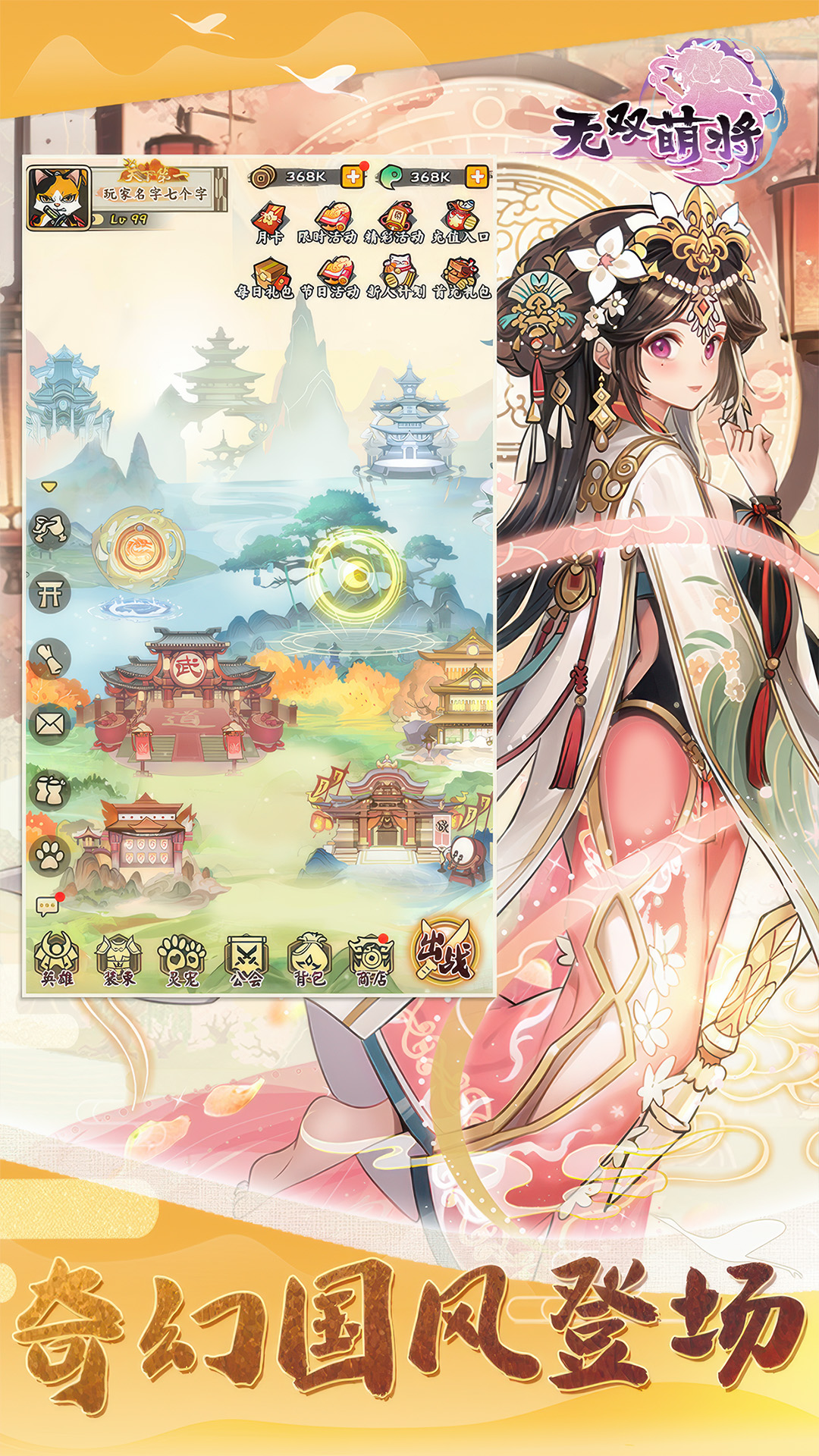 《无双萌将》是一款轻松休闲,随玩随停,英雄多样,阵容巧搭的异世修行国风放置挂机游戏。在游戏中,可以收集养成各种传说英雄(玄冥、姬轩辕、句芒等),解锁英雄好感,养成灵宠,收集藏品家具。同时,也可以与其他玩家一起加入公会共同面对强敌,合作挑战机关破阵、异界寻宝或在竞技场相互切磋。