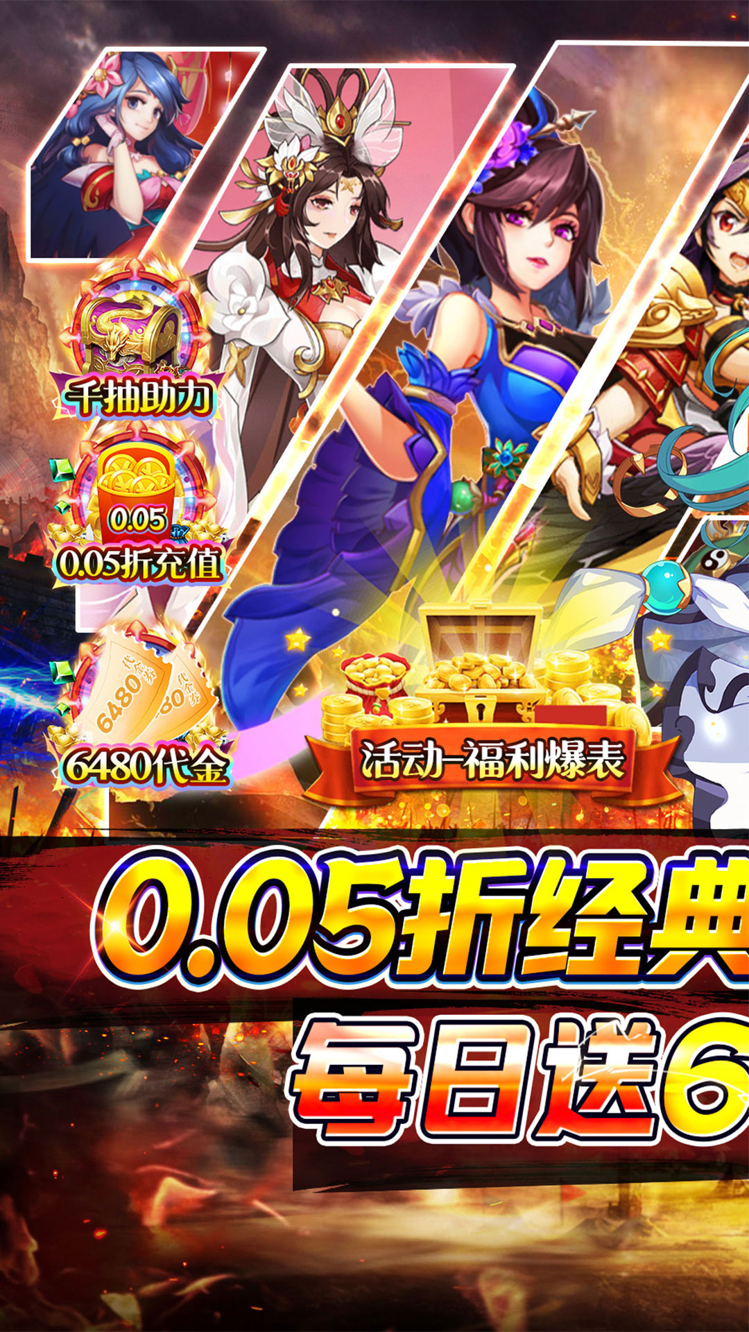 【0.05折扣充值】全场永久充值0.05折,历史名城,经典战役,三国名将;【福利代金券】每日保底领取6480代金券,可用于元宝充值,礼包购买;【新角好礼】上线即送名将礼包,海量元宝,丰富道具,海量英雄经验;【新服活动】新服狂欢,次日登录领取神将“七星-诸葛亮”,7日领取“济世-华佗”;【千抽福利】通关主线关卡,领取千抽神将令;