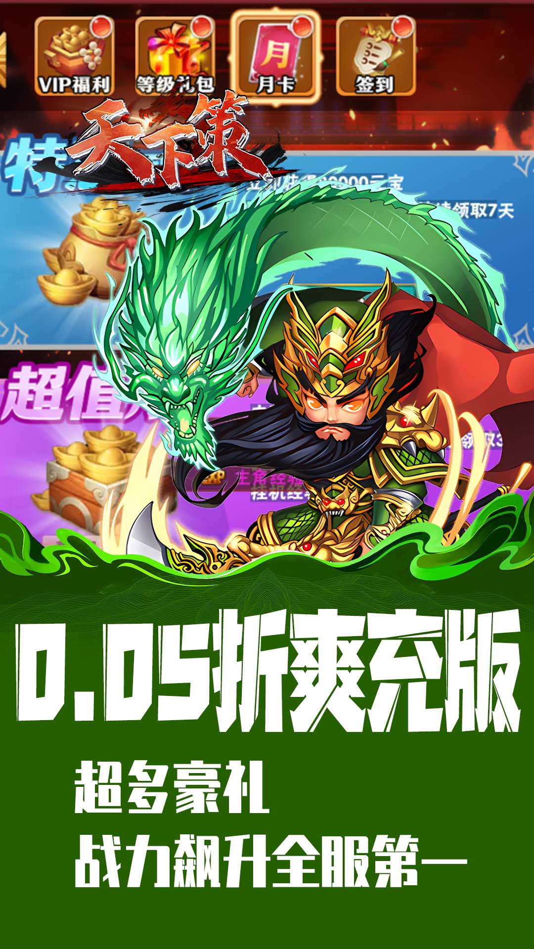 1、0.05折卡牌三国代金券买断免费版,每日签到送648代金券,仅需2000即可畅享无限代金券。2、创角即送VIP10 特权、1.88 万元宝与 188.88 万铜钱、专属称号“初露峥嵘”。3、每日签到可获得大量珍稀道具、珍贵材料,在线礼包送资源,开服狂欢活动,送充值卡、红将等等,豪礼不断。4、首充即送彩金武将-赵云,次日送极品龙鳞套装,第3日送暗金武将-曹操,天金武将任选礼包*1,龙鳞饰品。5、专属定制活动上线,强悍的英雄,拉风的战宠,称霸三国指日可待。