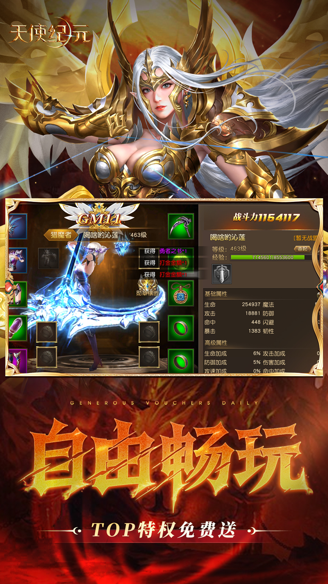 1、天天送千元限时代金券,打金点可兑代金券2、天天折上折,百倍充值福利,完成任务再送天使特权3、领满星大礼包,天使、精灵、坐骑、翅膀、神饰样样都有,战力起飞秒天秒地4、创角免费解锁GM,余额无限提充,无限资源、直购礼包一键激活5、百万真充免费送,在线即领,激活游戏内累充活动,奖励拿到手软6、创角即送GM11、钻石*88w、绑钻88w、金币*888w、金钥匙*2、S级经验丹*10,等级直升200+,更有绝版称号:高爆爽充MU ,等你来拿