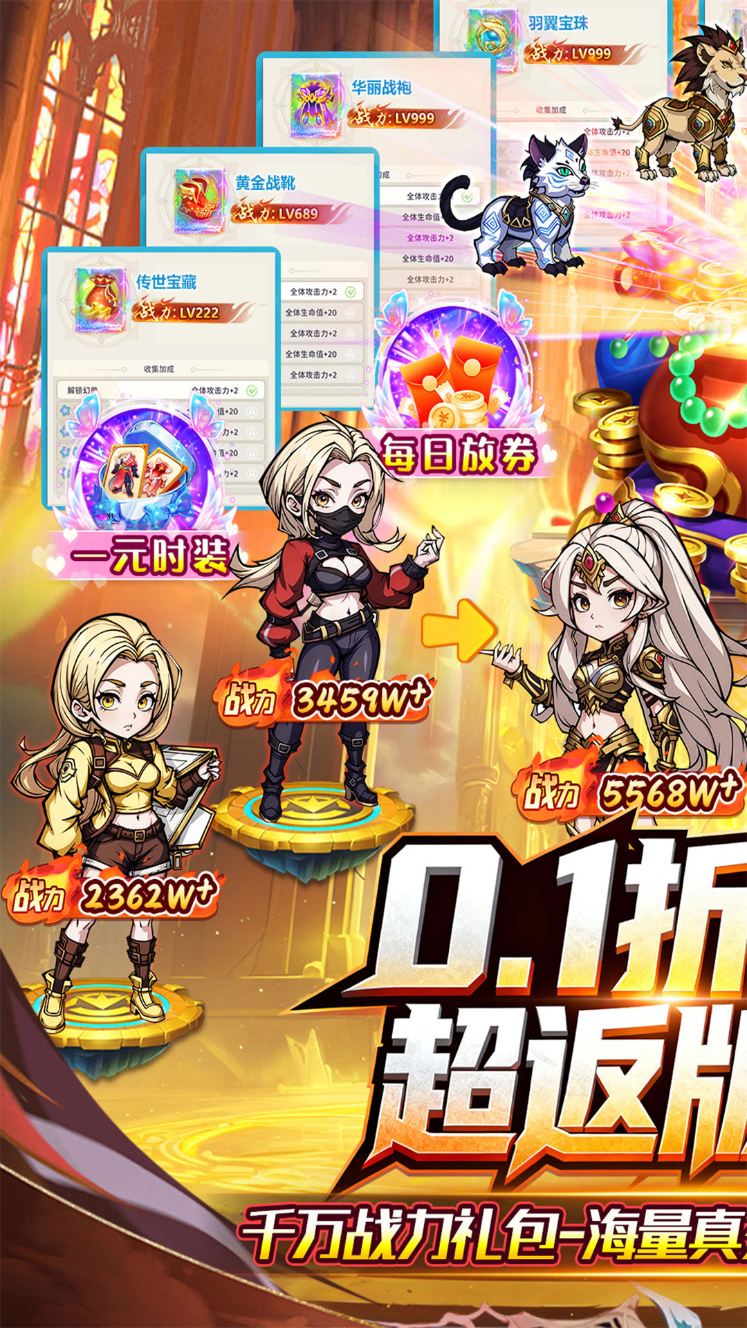 【永久0.1折】全场永久充值0.1折,不膨胀,648只需6.48;【每日648】每天登陆即可领取折前648元游戏现金券,购买游戏内一切礼包;【真充红包】游戏内即可获取大量充值红包,使用后获得丰富货币和VIP经验;【七日福利】轻松领取千万战力礼包,打怪升级,快人一步;【探索冒险】卡通风格画面,色彩丰富,场景细腻,为玩家呈现一个梦幻般的冒险世界;