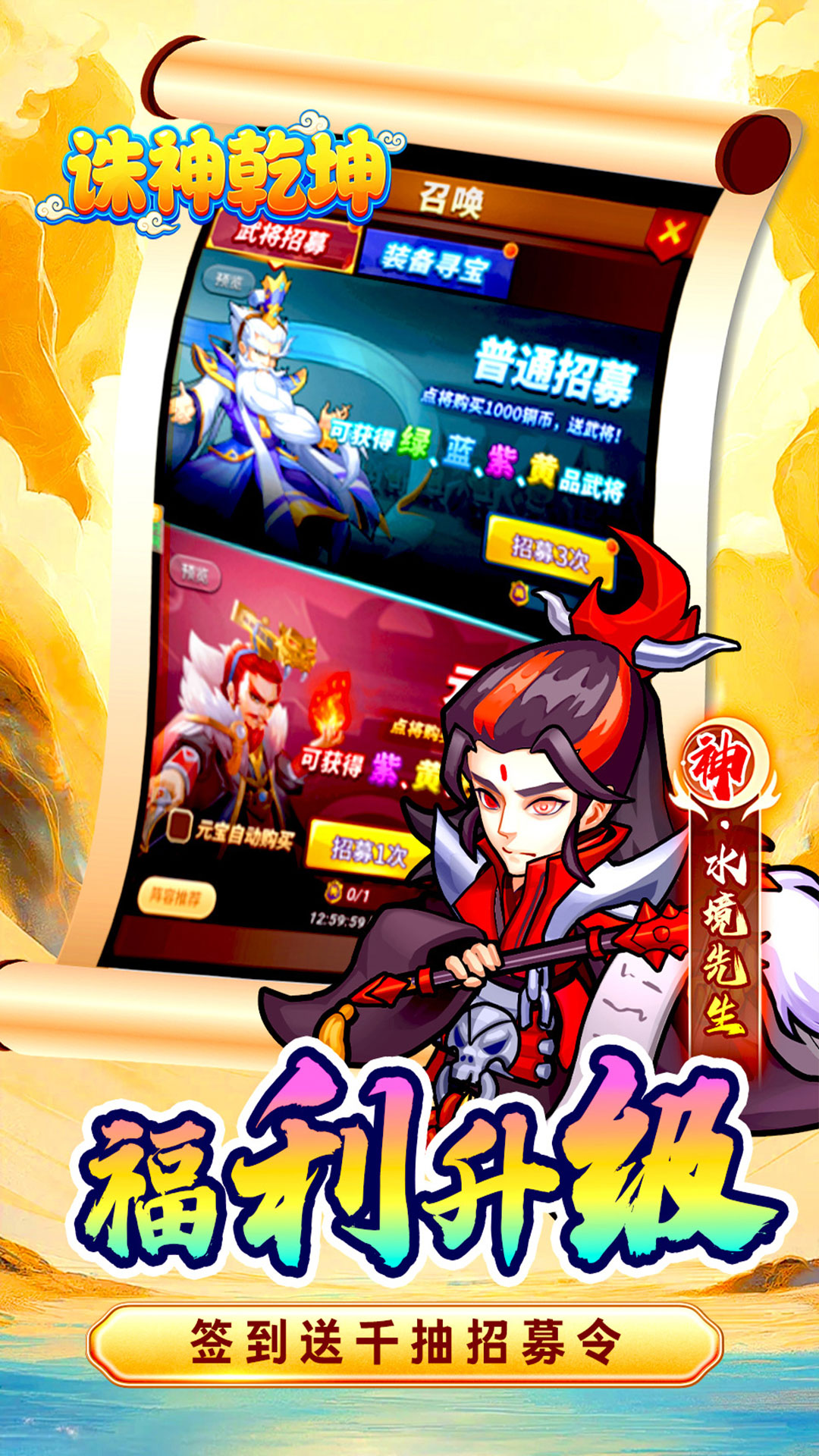 ★★【永久0.05折】0.05折永久代充,拒绝数据膨胀;★★【无限代充】每日签到领3W代充劵,无限白嫖充值;★★【起号福利】创角送200W代充券,神关羽+红品神装★★【等级豪礼】30级免费领取千抽福利召唤令,无限招募;★★【摸鱼福利】自动推图,解放双手,休闲三国,摸鱼必备。