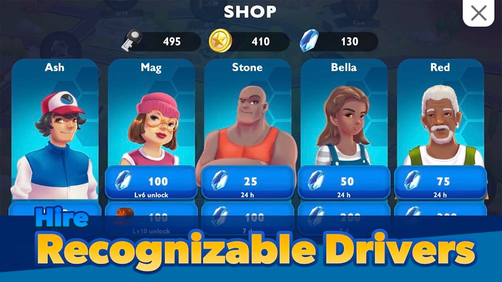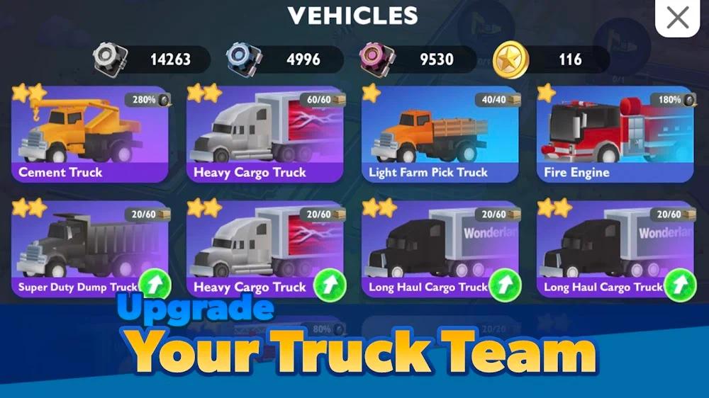 首先,驾驶你的卡车将货物运送到城市中的特定建筑物。游戏提供了多种卡车供你选择,包括水泥搅拌车、皮卡、欧式自卸车、重型货车、轻型农用货车、消防车、超重型自卸车、长途货车等等。游戏操作简单易上手,只需点击屏幕即可取货和送货。你还需要雇佣司机、管理他们的工资,并处理其他业务,例如保险和税务。务必雇佣像Ash、Mag、Stone、Bella、Red、Alice、Bob、Vicky等这样技能娴熟、知名度高的司机。建造并升级你的知名连锁商店“沃尔玛超市”,通过这家商店你可以赚取更多收入,因为这是目前流行的营销方式。