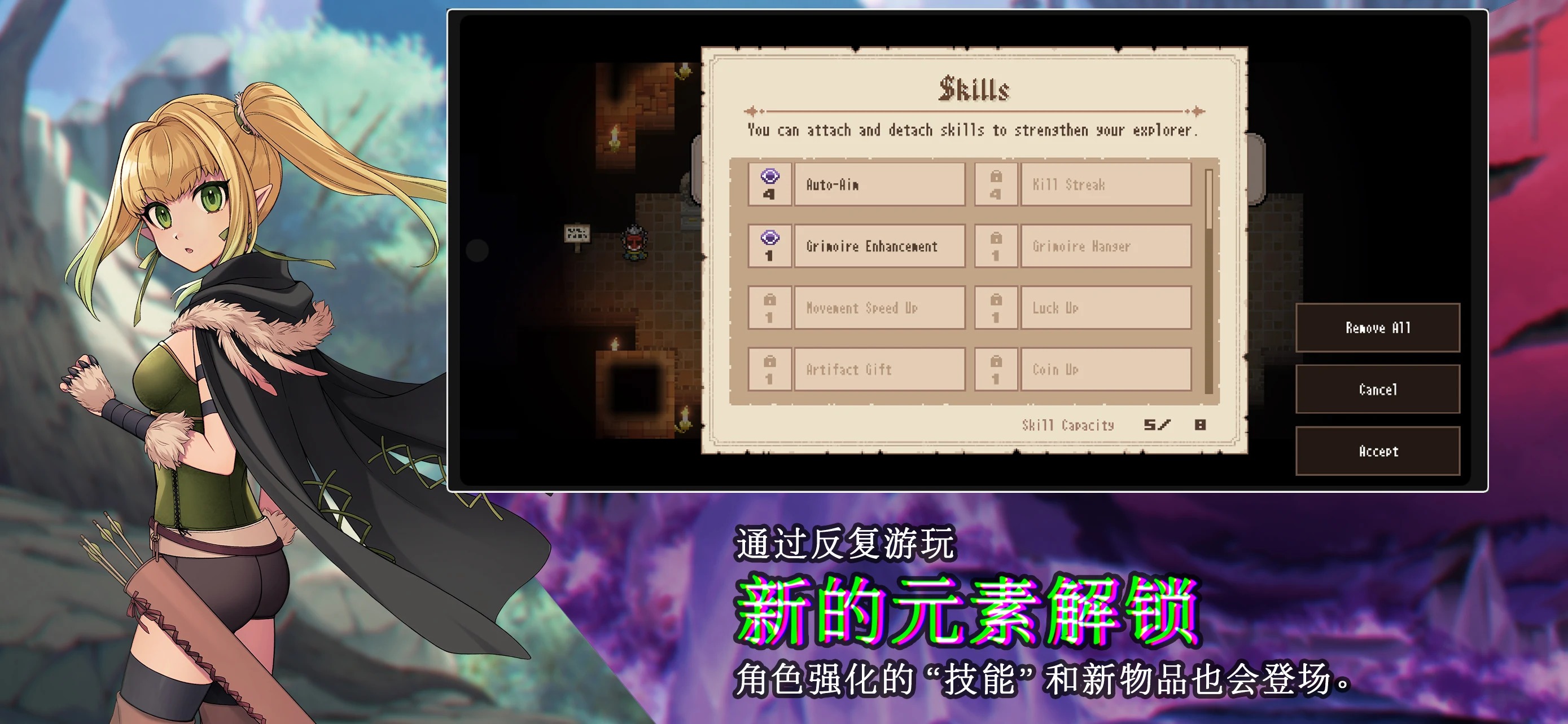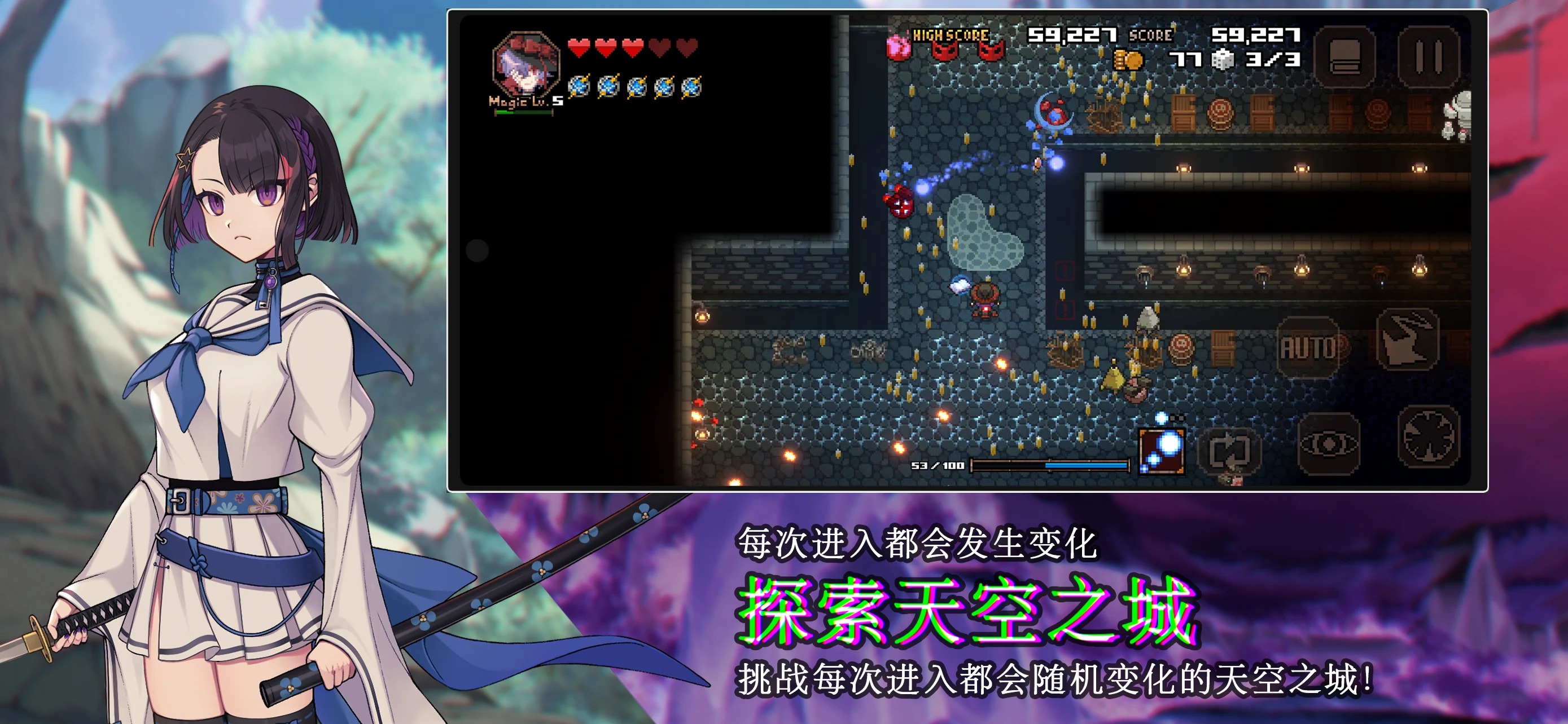 玩家通过双摇杆操作“探索者”,在迷宫中进行弹幕射击的冒险。每次进入迷宫时,结构都会有所不同,遇到的地形、敌人和道具也是随机的。如果 HP 降至 0,探索过程中获得的道具将全部丢失。让我们伴随探索中的独特魔法,一同踏破迷宫,向前迈进!