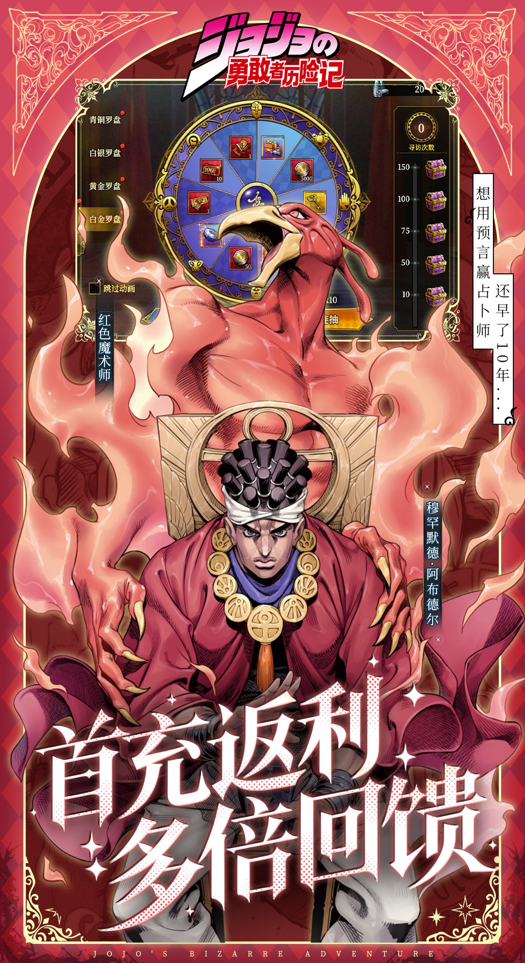 ★【永久0.1折】完美复刻动漫经典场景,全新0.1折版本,绝对真实折扣!★【创角福利】免费觉醒!开局就送UR英雄-东方仗助,抢占先机,快人一步!★【七日目标】完成七日目标,东方仗助免费升至觉醒2阶,制霸全服,畅通无阻!★【八日签到】次日领取SSR英灵-埃及艳后,7日领取648元代金券,8日更有顶级传说装备全套赠送!★【打金特权】每日命运罗盘抽奖,珍贵资源材料大量产出,无限白嫖!★【在线奖励】每日在线领取大量钻石+命运罗盘弹头,可用于打金特权抽奖!