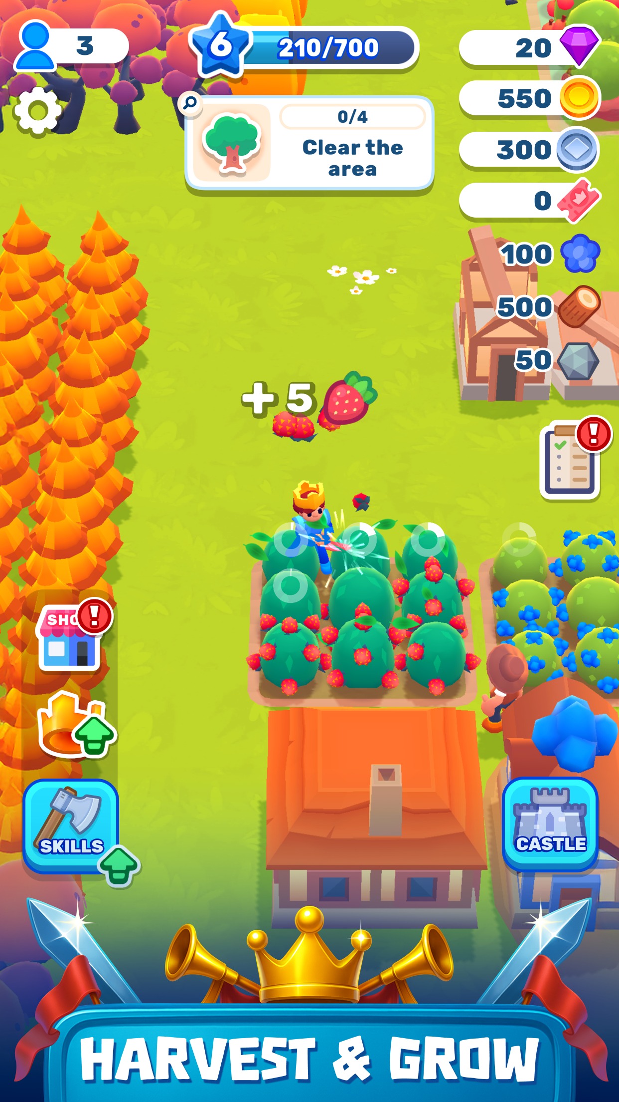 放置元素——虽然你需要动脑筋思考如何采摘草莓和开采岩石,但游戏的放置元素让游戏充满乐趣和放松。很快,你就会拥有大量随时待命的工人,随时准备为他们的领袖建造、防御和收获。不过别担心,任何时候你想从游戏中稍事休息,参与到收获的活动中来,我们都非常欢迎!