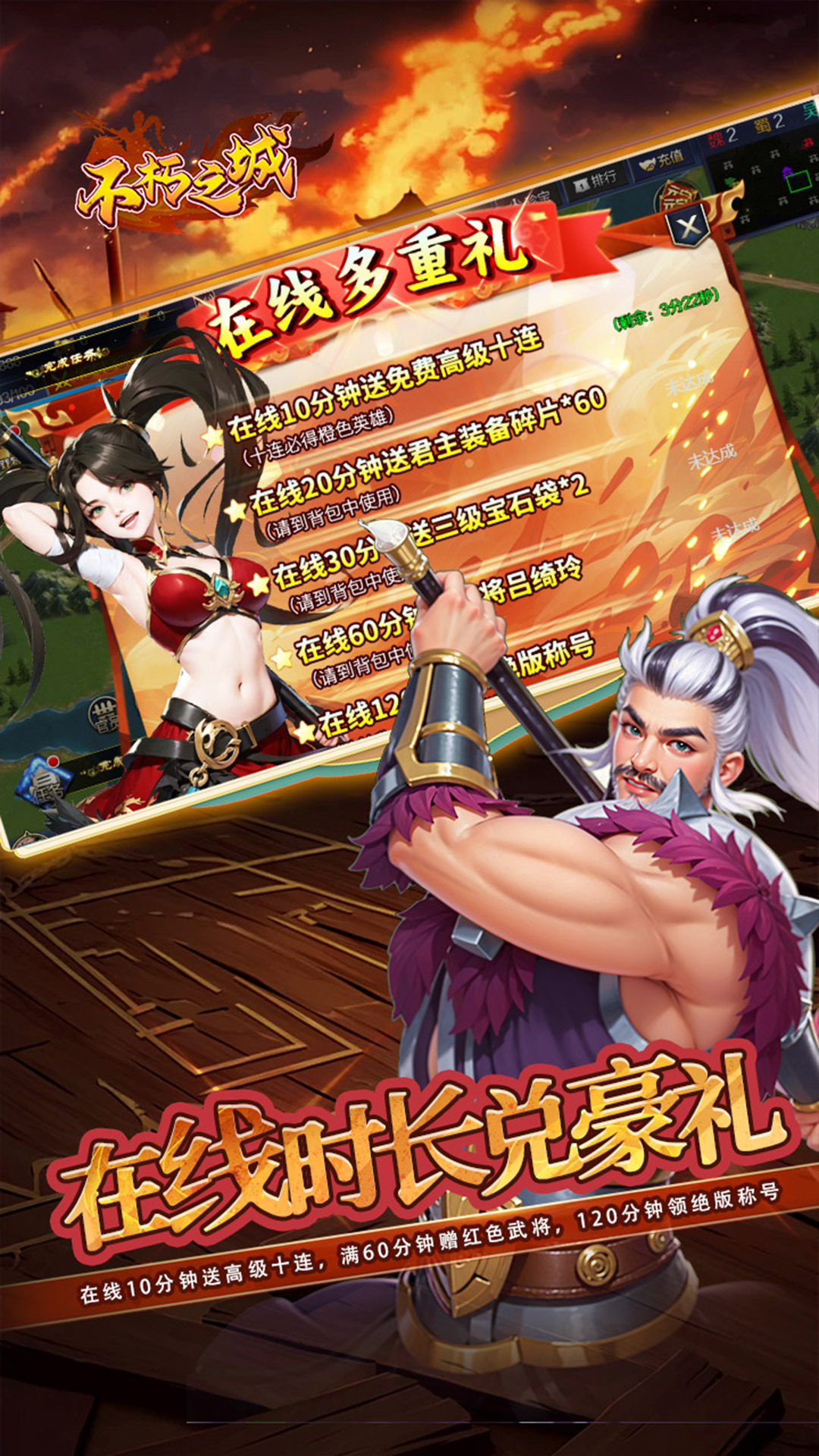 首登即享至尊礼:SVIP1激活卡、福利宝箱、88抽奖券、8888元宝、888万银两开局即得开服集字赢称号:收集“开服大吉庆”五字即可兑换唯一称号“新区先锋”,开服庆典专属荣耀七日任务领神兵:完成七日日常任务即可领取青龙长枪、神将卡包等终极珍稀大奖在线时长兑豪礼:在线10分钟送高级十连,满60分钟赠红色武将,120分钟领绝版称号累计登录领红包:连续登录即可获充值卡,累计最高可得10万元红包,轻松畅享白嫖盛宴