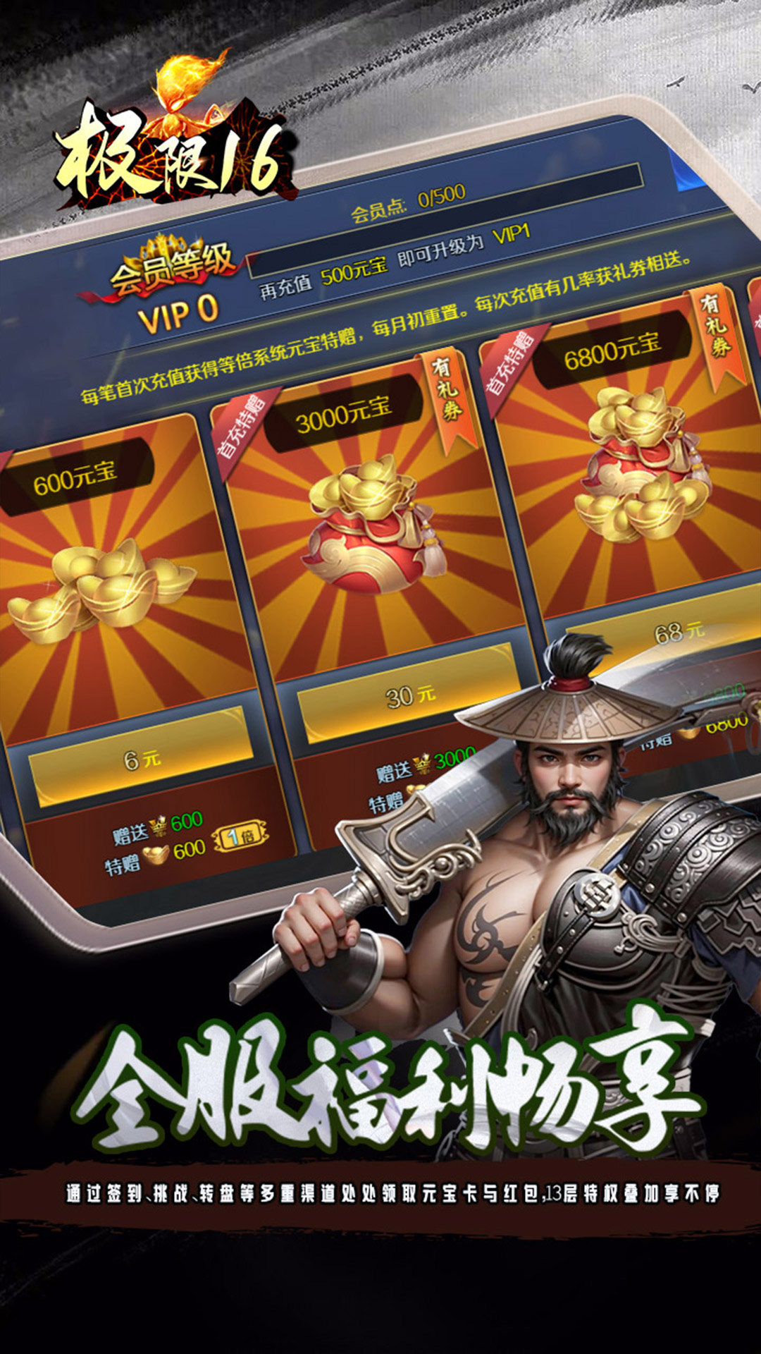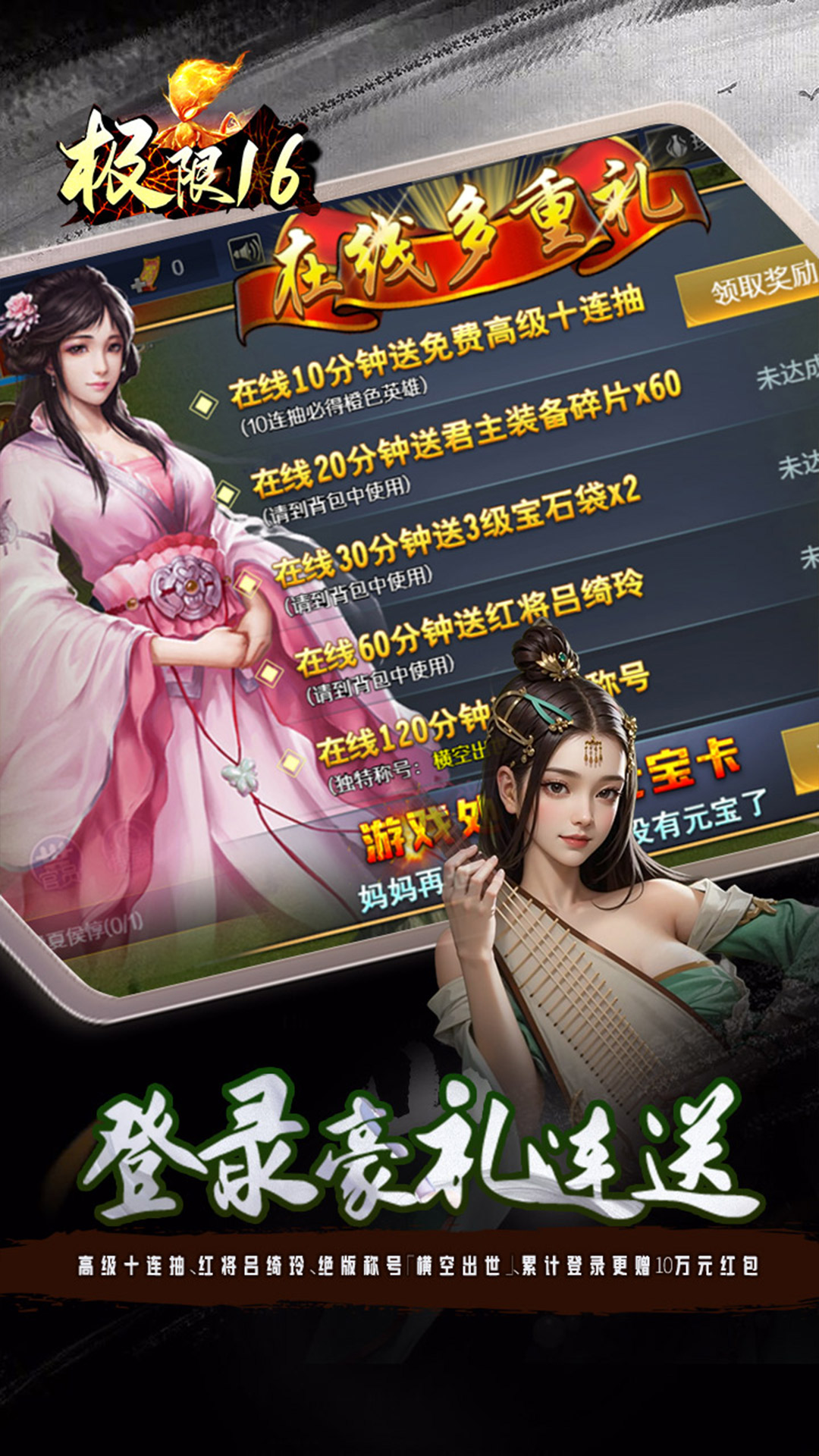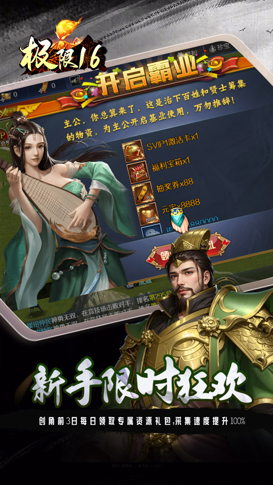 首登即享尊荣礼:SVIP1激活卡、8888元宝、888万银两、88连抽、福利宝箱及开服魔将全服福利畅享:通过签到、挑战、转盘等多重渠道处处领取元宝卡与红包,13层特权叠加享不停登录豪礼连送:高级十连抽、红将吕绮玲、绝版称号「横空出世」、累计登录更赠10万元红包新手限时狂欢:创角前3日每日领取专属资源礼包,采集速度提升100%在线送抽奖券:每日在线即可获得120连抽,轻松无忧变强七日狂欢盛典:连续登录每日领取不重样养成礼,第七天更送青龙长枪与SS级神将