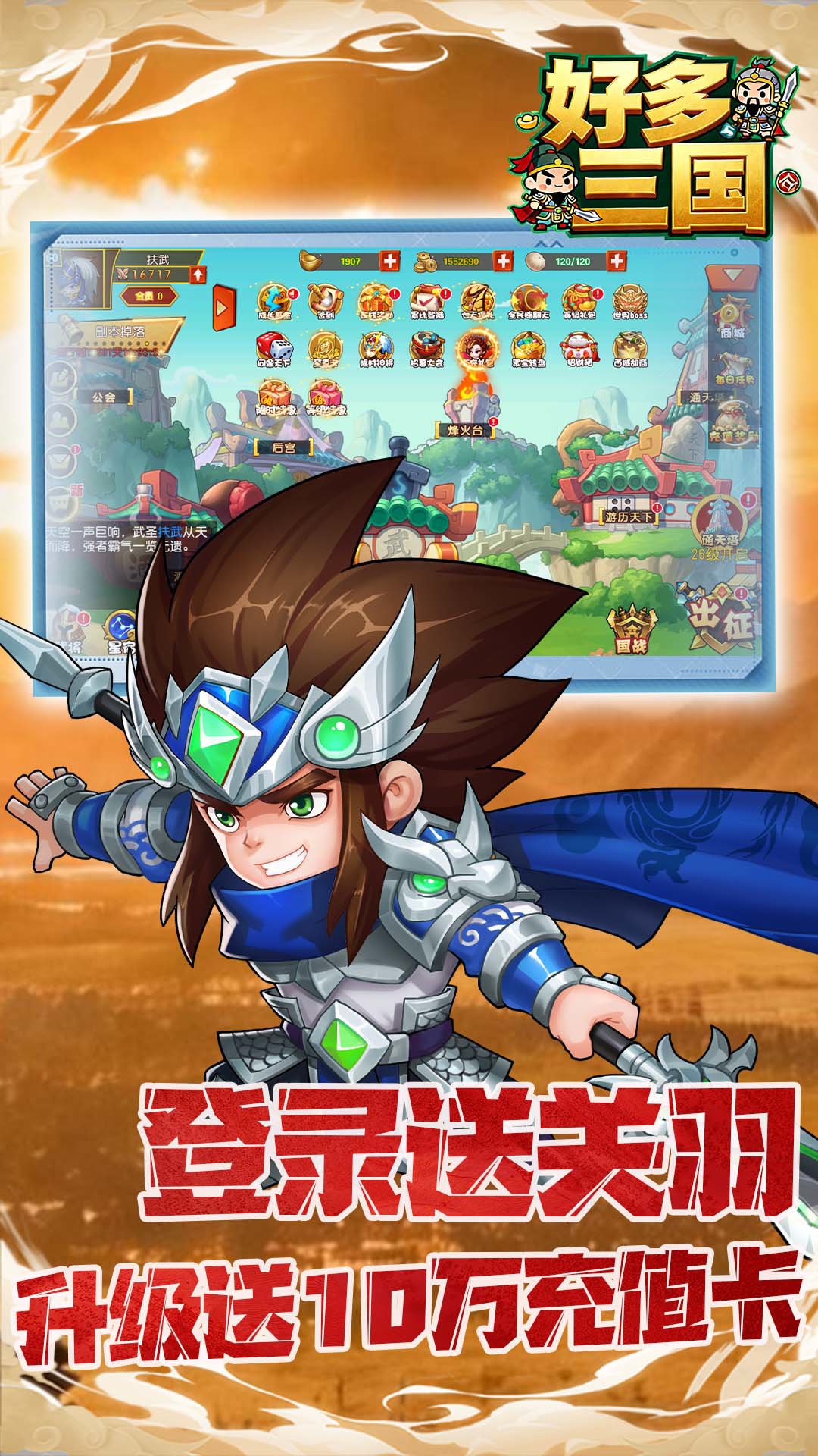 创角福利:创建角色直接送SS级武将关羽与国战红包登录即送神将神兵:累计登录解锁SS级绝色武将貂蝉,配套强力神兵同步发放,开局就享顶配战力世界BOSS狂揽资源:挑战世界BOSS赢取超额回报,海量珍稀材料、高阶道具随心拿,快速提升战力上限。成长基金十倍返利:超值成长基金重磅上线,投入即享十倍返利福利,低投入高回报,助力全程飞速成长在线奖励:在线时长累计一定时间,每天领取100抽等级豪礼:达到相应等级,免费领取10万充值卡
