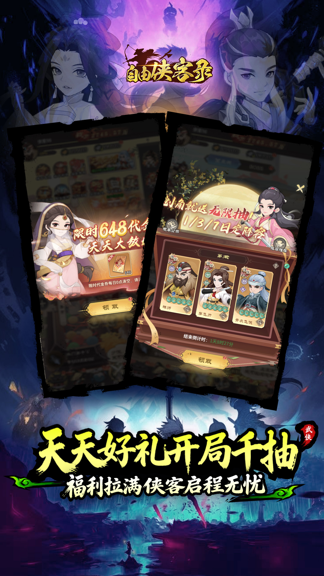 1.全场永久0.1折,登录即送千抽,江湖英雄轻松入手!2.拒绝物价膨胀,享受官服体验!3.上线即送648元,首发专享!4.首充送顶级侠客郭大侠,传说套装!5.转游福利,豪华礼包,让你赢在起跑线!6.冠名得豪华线下返利;8.新服福利 七天登录送魔令狐!