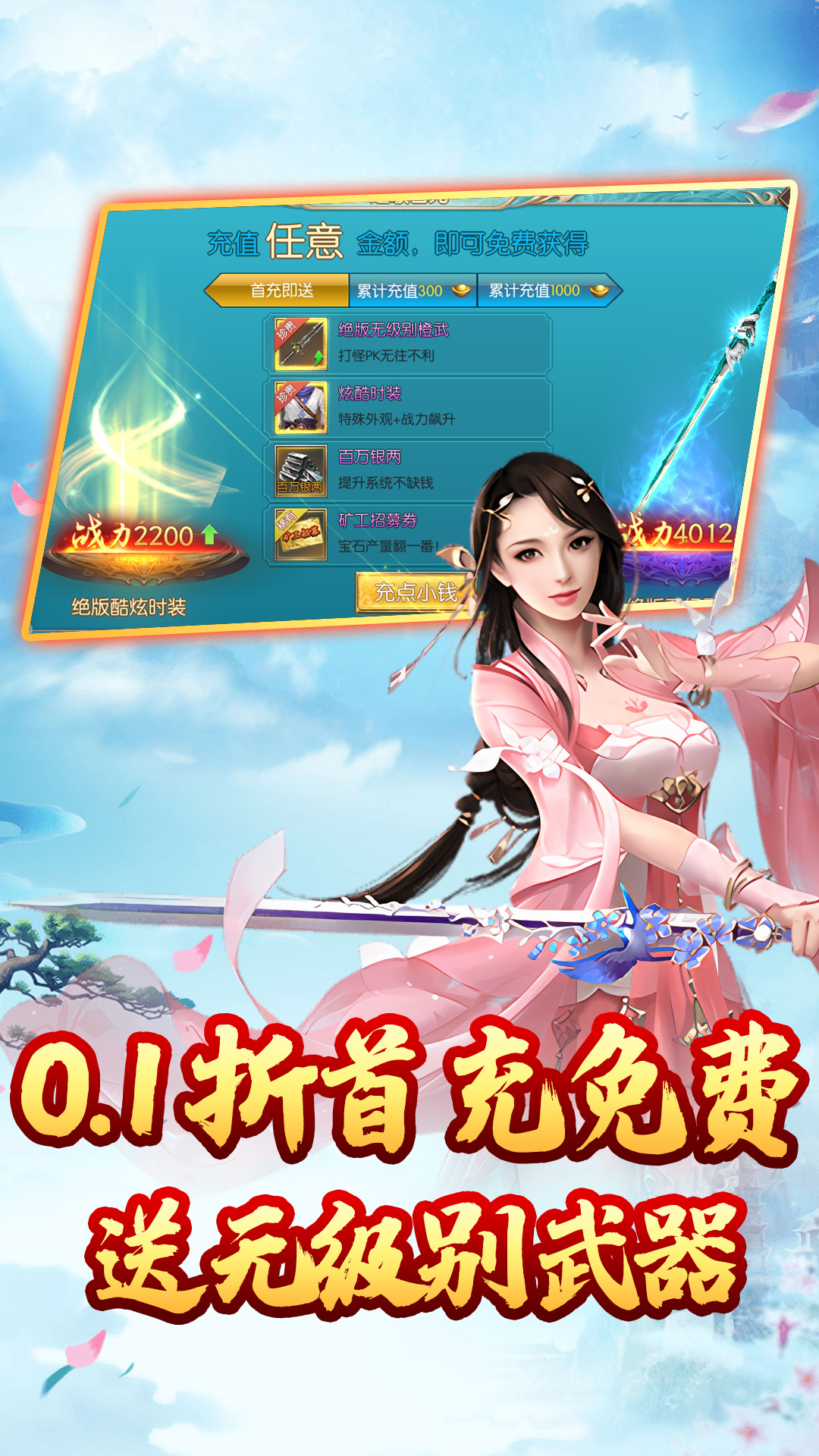 1、全新0.1折福利版,上线即送648,平台在送648代金券2、上线首充免费送无级别武器、超绝炫酷时装3、线下超强福利,无级别、称号、时装全新福利
