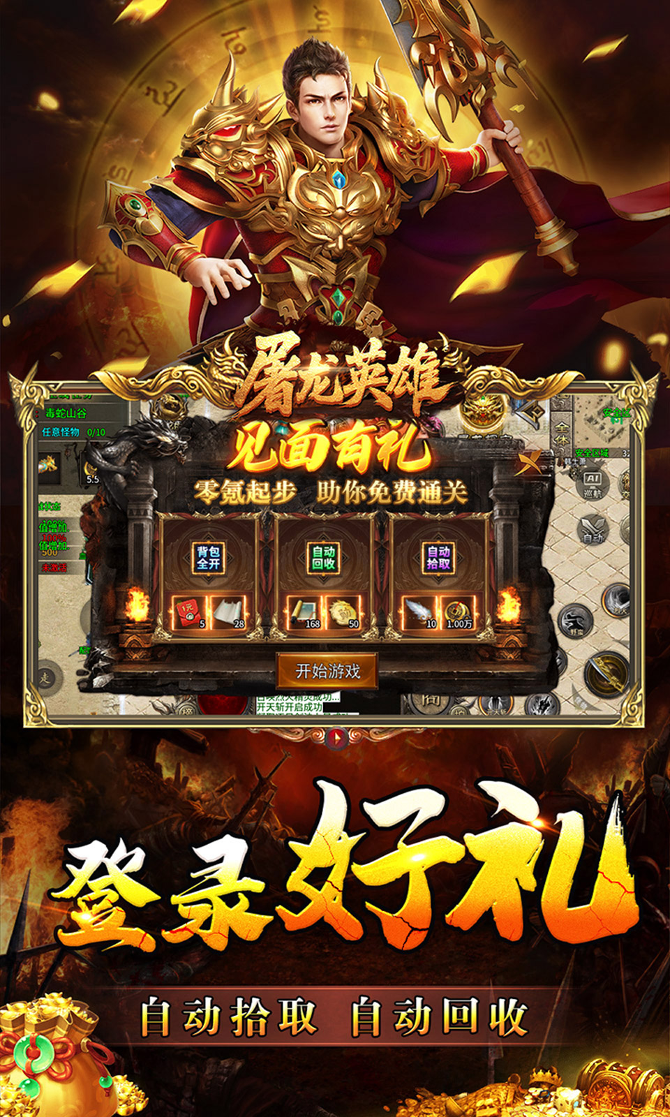 ★【起步好礼】自动拾取、自动回收、背包全开★【屠魔悬赏】完成任务获取丰厚奖励★【实物回收】打怪掉落,回收领灵符★【还有更多】每日狂欢、在线奖励、全服首爆...