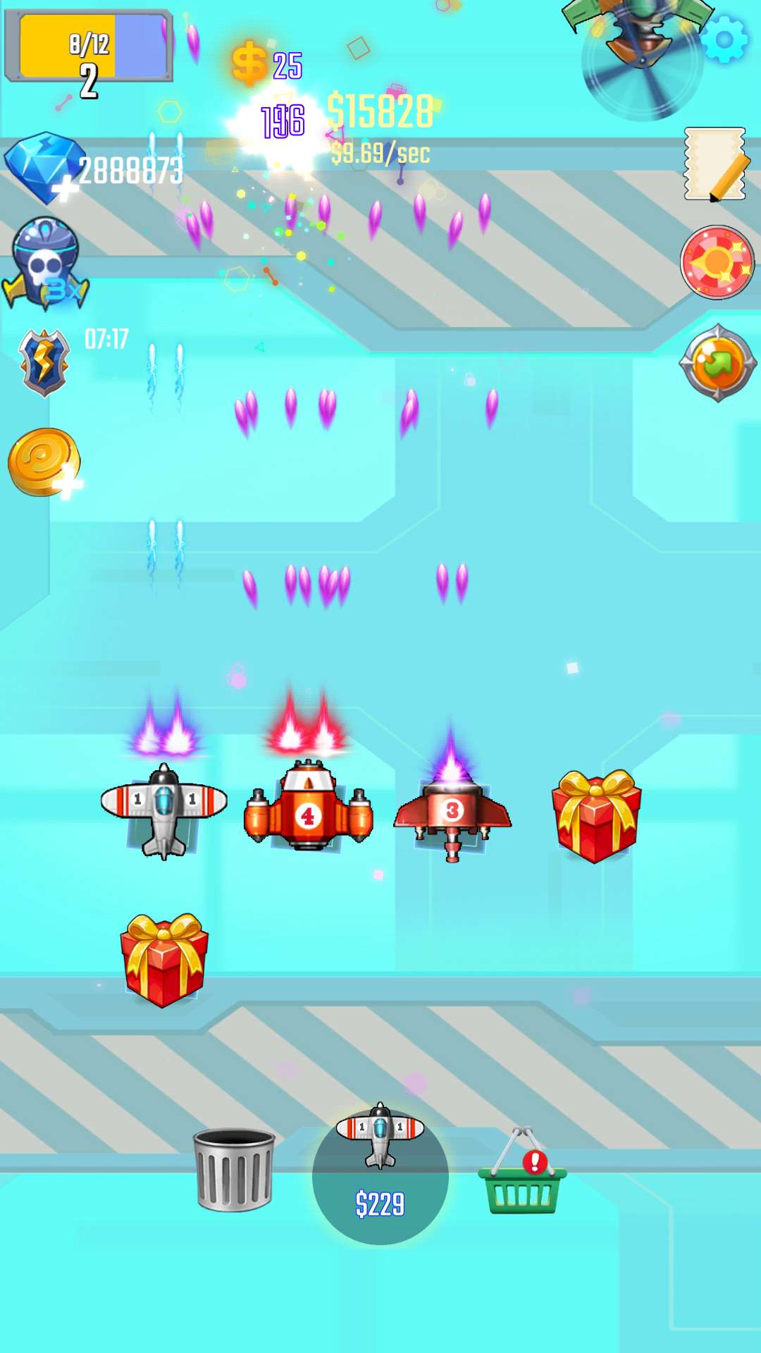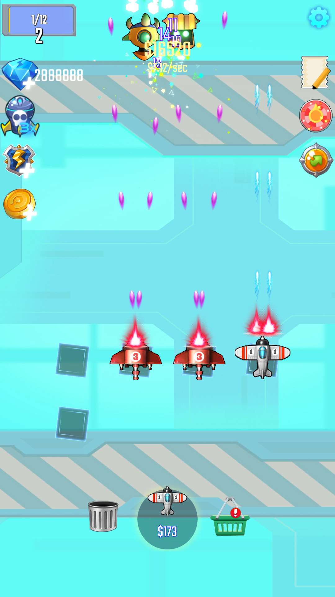 将两架完全相同的战机组合成一架更先进的战机,击败进攻的敌机,获得更多战利品,提升战机的威力和水平。