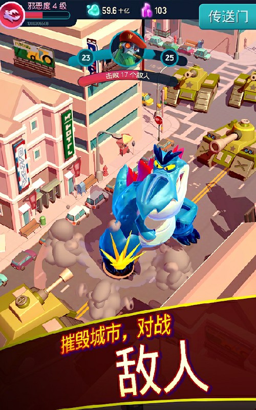 你是一只被困在陌生城市的巨型怪物。你唯一的目标就是尽可能毁灭一切!在色彩缤纷的世界中横冲直撞,粉碎路上的一切。