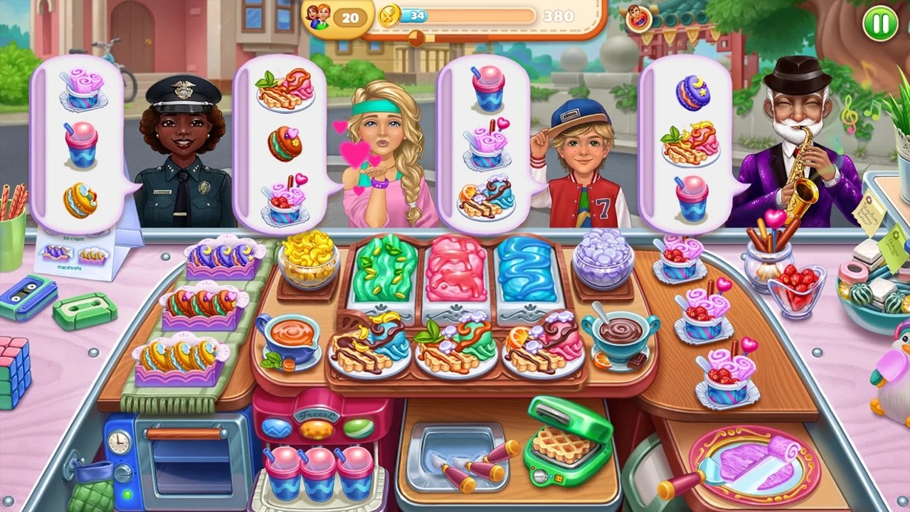 story精彩的故事。与其他免费的美食游戏不同,该游戏具有出色的叙述性。与经理罗杰(Roger),花店莎莎(Sasha),厨师贝克(Baker),木匠萨姆(Sam)和兽医(May vet)见面。厨房里从来没有太多的厨师!与他们一起击败竞争对手:弗雷兹夫人和腐败的检查员。