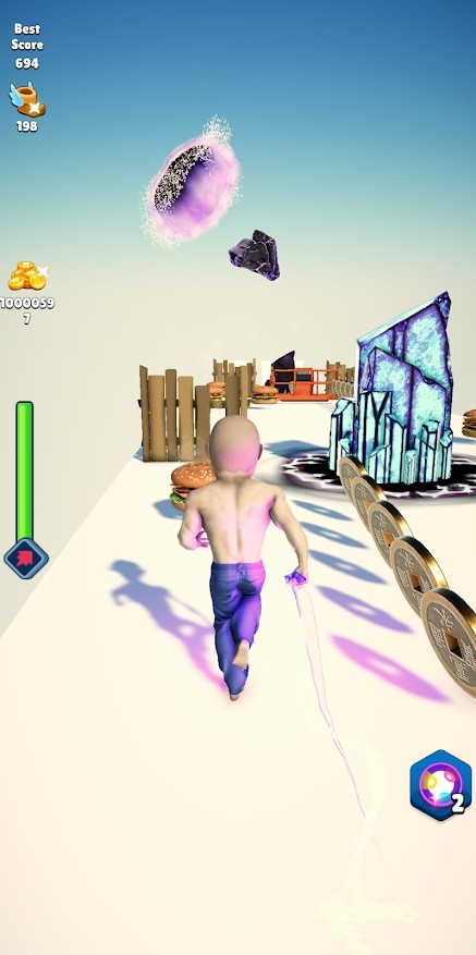 冲破障碍物,躲避巨大的动力锤,躲避迎面而来的车辆,用多汁的汉堡填满你的身体作为燃料,堆积你的硬币并购买能量和魔法力量。