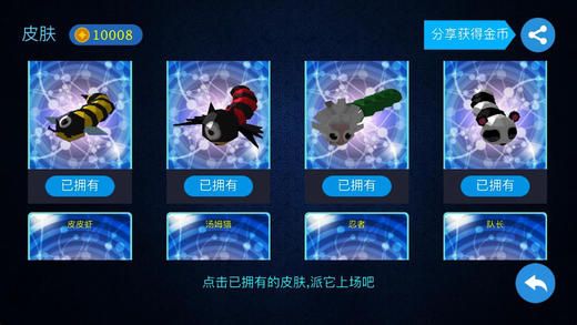 2.超过18种全新设计的皮肤,如 海盗,忍者,皮皮虾,爱因斯坦,甚至是像素人,超越脑洞极限的想象,这里应有尽有。而且你可以免费拥有其中5款皮肤,而更多的皮肤可通过分享游戏获得,你不用花一分钱,我不差钱,就是这么豪气。