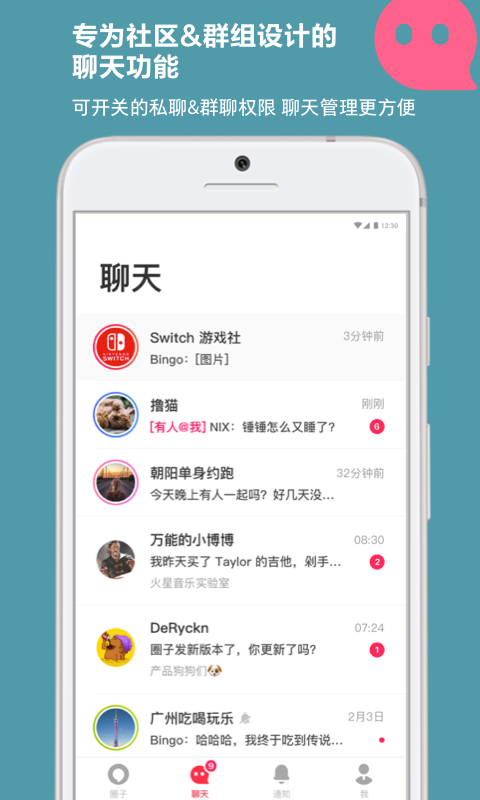 群聊:可选择开启圈内群聊,让成员在全员群内畅快沟通。