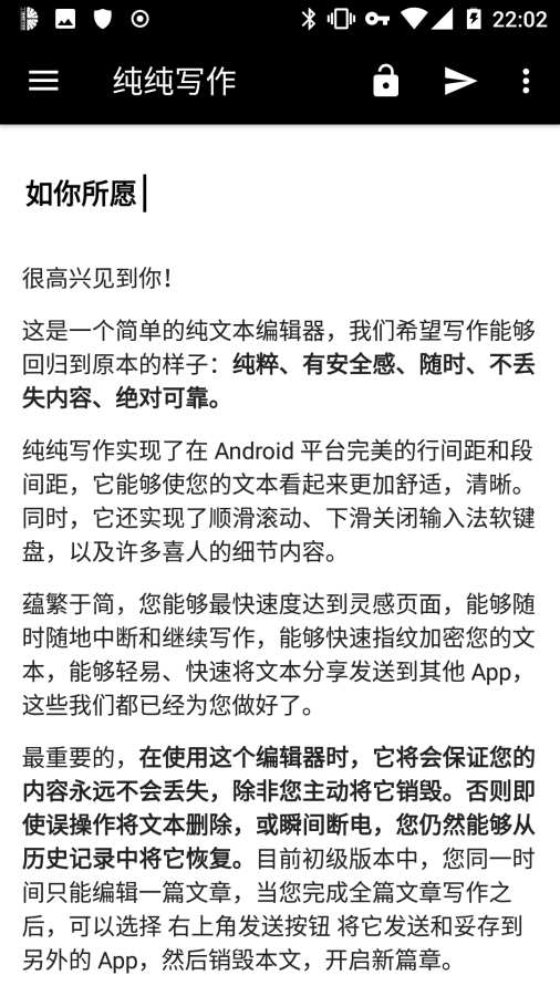 纯纯写作,很高兴见到你!这是一个简单的纯文本编辑器,我们希望写作能够回归到原本的样子:纯粹、有安全感、随时、不丢失内容、绝对可靠。纯纯写作实现了在 Android 平台完美的行间距和段间距,它能够使您的文本看起来更加舒适,清晰。同时,它还实现了顺滑滚动、下滑关闭输入法软键盘,以及许多喜人的细节内容。