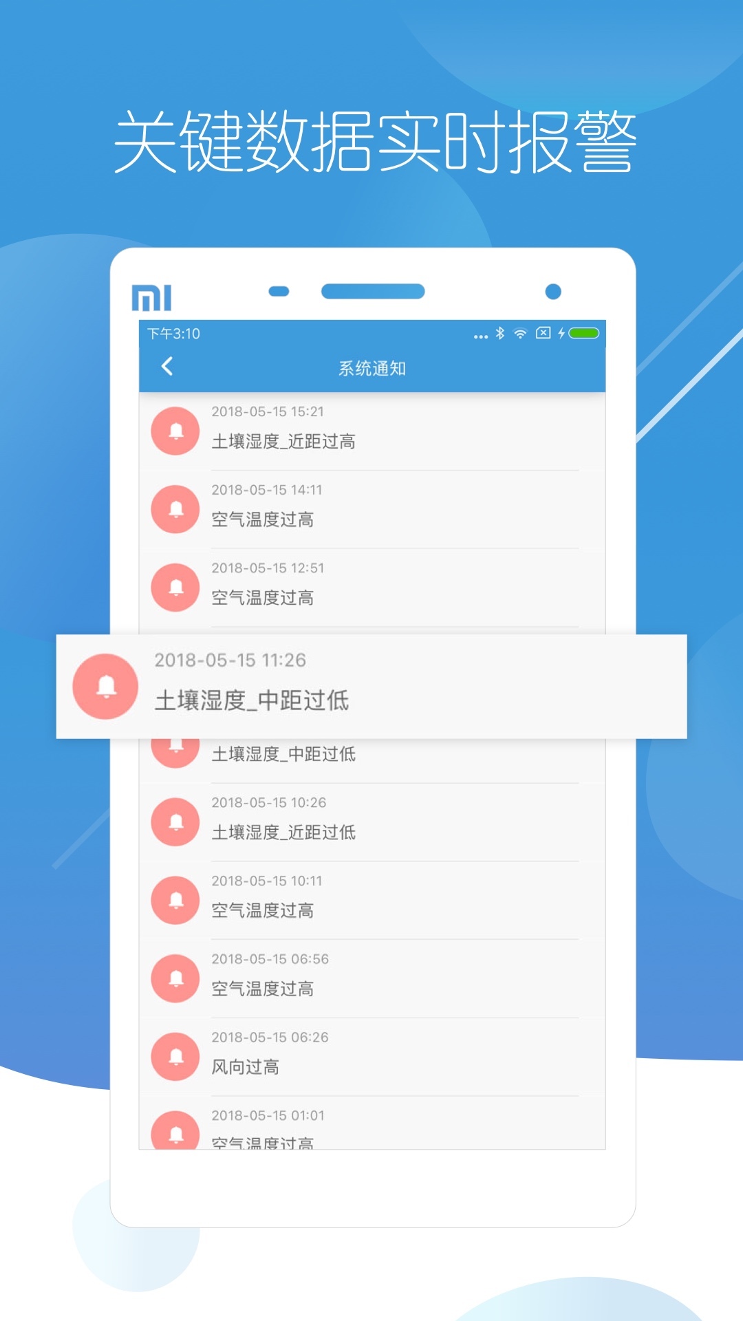 农业智能硬件,信息采集,大数据处理。然后通过此app展示给客户,让农户可以方便地看到自己的田地实时信息,可以设置一定的阈值,通过警报通知告知农户,然后去浇水施肥降温通风等操作。此外,农户还可以通过此app向有关农业专家咨询病虫害,记录自己的农事,以便于以后翻阅。