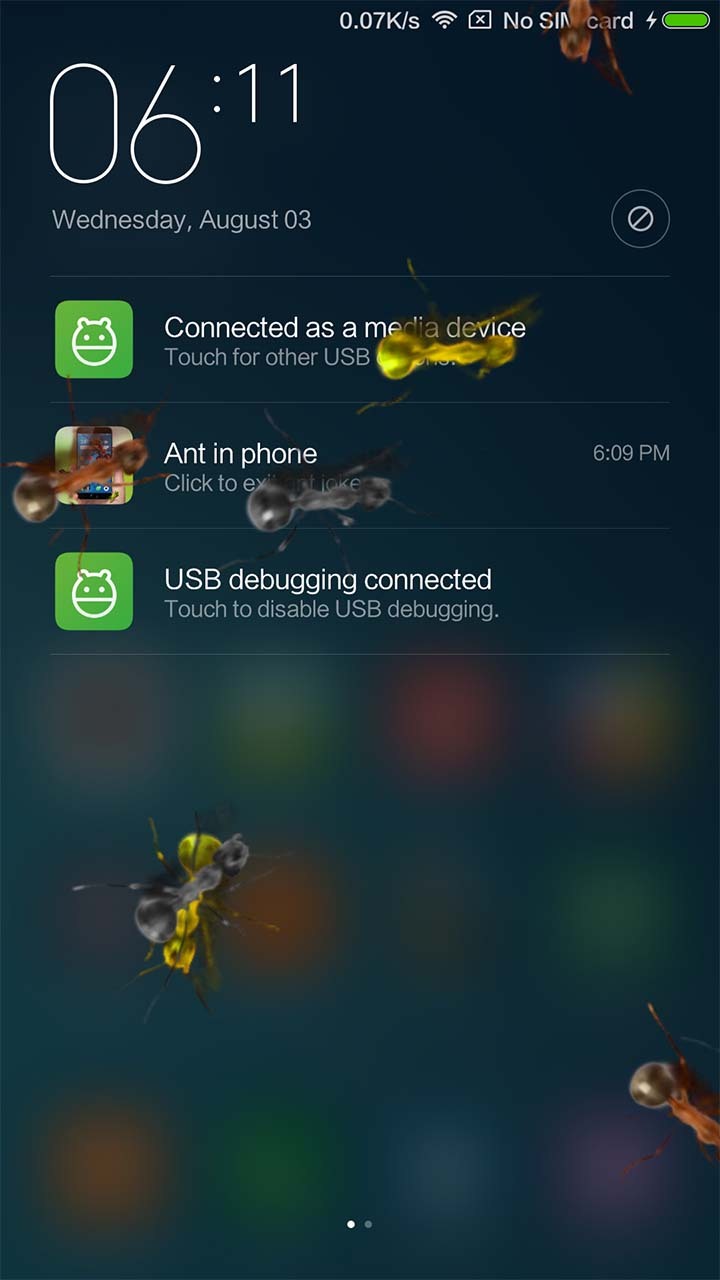 比如假借用好友的手机打电话,悄悄安装启动本应用,设置延时10秒显示蚂蚁,然后将手机还回给好友,好友拿到手机后,不久就会出现蚂蚁在手机上爬行,好友会被吓到的,达到恶作剧的效果。