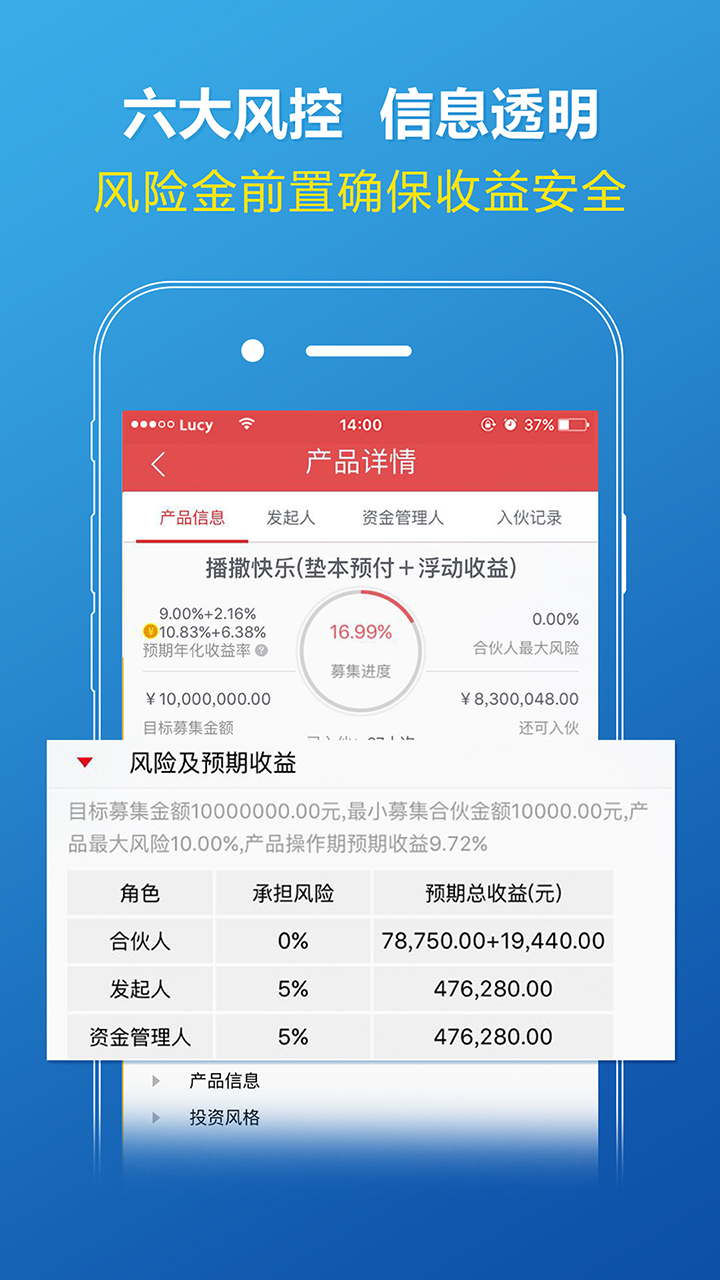 入伙:入伙理财产品专区,用户可根据募集进度、预期年化、风险、募集剩余时间等方式选择;