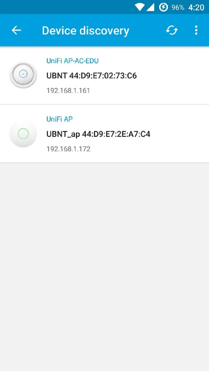3. 如果您的移动终端的 Wi-Fi 功能已打开且与 UniFi AP 在同一个 2 层子网中,那么 UniFi AP 将会自动出现在设备列表. (与其他 Ubiquiti 产品的 2 层发现功能相同)