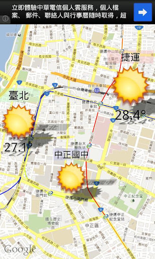 用地图即时显示台湾天气的小程式,想知道「现在」哪里有没有下雨,天气好不好一按即知。 用地图即时显示台湾天气的小程式想知道「现在」哪里有没有下雨,天气好不好一按即知。 地图界面:长按地图可以显示该点的天气状况(运算猜测方式)和*近的天气观测站天气状况(实际观测站数值)。再按一下天气图示可进一步操作按绿底标题的图示是天气观测站有温度、风力、风向、雨量数值。按紫底标题的图示是雨量观测站仅有雨量数值。按没有标题的图示可以加入*爱并变成红底标题。按红底标题的图示是显示该点位置附近的天气观测站。再按一次同个红底标题的图示是删除该点*爱。图示有10、60、3等是表示时间内的降雨量,如十分钟内的降雨量,超过0表示十分钟内有下雨。风力有个分隔符号『|』,左边是平均阵风,右边*阵风。 选单:我的位置:可以定位到装置的位置设定:可以设定全萤幕、程式启动时的定位位置、地图自动缩放、定位装置的方式更新数据:更新天气信息气象局PDA:连结至气象局网站搜寻:直接输入该点地址定位到该位置,例:台北101关闭:结束程式 附注:本程式暂无预报功能仅有即时信息,需预报信息可从选单连到气象局网站,每次启动都需连结网路下载*天气信息,且装置的时间需设定正确,信息仅供参考不保证准确性,信息来源气象局,不支援安装广告免疫、adblock等的装置。
