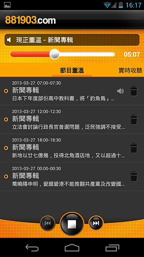 「商台节目重温」是由深受广大听众欢迎的香港商业电台所开发之节目重温应用程式,供Android用户于Play Store免费下载及安装。881903.com付费会员可随时随地足本重温商业电台节目,同时为所有用户提供免费试听、网上直播以及Hong Kong Toolbar特设频道。 「商台节目重温」支援Android作业系统 2.3或以上版本,用户可同时间收听节目及进行其他元件作业。 功能: ◎ 收听商业电台节目重温- 付费会员可足本重温过去三个月节目,并传输节目以供脱机收听- 用户可免费试听节目精华 ◎ 收听商业电台直播 - 雷霆881商业一台、叱咤903商业二台、AM864外语频道 ◎ 收听Hong Kong Toolbar特设频道 如欲登记成为881903.com会员,请浏览http://www5.881903.com/apps/crmembership/reg_selectlevel.html " target="_blank">http://www5.881903.com/apps/crmembership/reg_selectlevel.html *请注意: 本应用程式内任何收听电台直播及传输节目等一切活动,将会牵涉有关WiFi使用量或 GPRS/ 3G/ EDGE /4G等流动网路数据流量,您的流动网络供应商可能会就您的数据传输用量收取费用。有关互联网连接设定、Wi-Fi使用量及流动数据流量收费详情,请向您的流动网络供应商查询。 This application is produced by Commercial Radio Hong Kong (CRHK), the most popular radio station in Hong Kong, providing the following content: ?Free Promo version of Highlighted Program Archives?Full version of all program archives for 881903.com subscribers?Live Radio Streaming?Hong Kong Toolbar exclusive channels To register 881903.com membership, please visithttp://www5.881903.com/apps/crmembership/reg_selectlevel.html " target="_blank">http://www5.881903.com/apps/crmembership/reg_selectlevel.html *Caution:All activities in this application, including live radio listening and program data transfer, involve WiFi usage and/or mobile network data transfer such as GPRS/ 3G/ EDGE /4G, etc. This may incur data transfer fee charged by your telecommunication service provider based on the data volume used. For Internet connection setting and data transmission charges, please check with your telecommunication service provider for details.