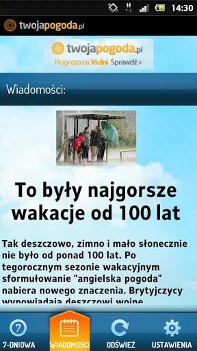TwojaPogoda.pl Pogoda w Polsce i na wiecie na Twoim telefonieTwojaPogoda.pl najpopularniejszy serwis pogodowy w Polsce.Jestemy na czele rankingu popularnoci Money.pl i Megapanel PBIGemius wrd serwisw pogodowych. Aplikacja w przejrzystej i czytelnej formie przenosi na Twj telefon wszystko co lubisz na TwojaPogoda.plMoesz doda ulubione lokacje i by na bieco z pogod gdziekolwiek jeste. W aplikacji znajdziesz midzy innymi: szczegowe prognozy pogody dla 2,5 tysica miejscowoci. prognoza pogody na najblisz godzin, na noc i na jutro z uwzgldnieniem temperatury, zachmurzenia, sumy opadw, cinienia i pozostaych czynnikw pogodowych udostpnianych w serwisie. prognozy temperatury i zachmurzenia w przedziaach trzygodzinnych. prognozy temperatury maksymalnej i minimalnej oraz zachmurzenia na 7 dni. najnowsze wiadomoci i ciekawostki.