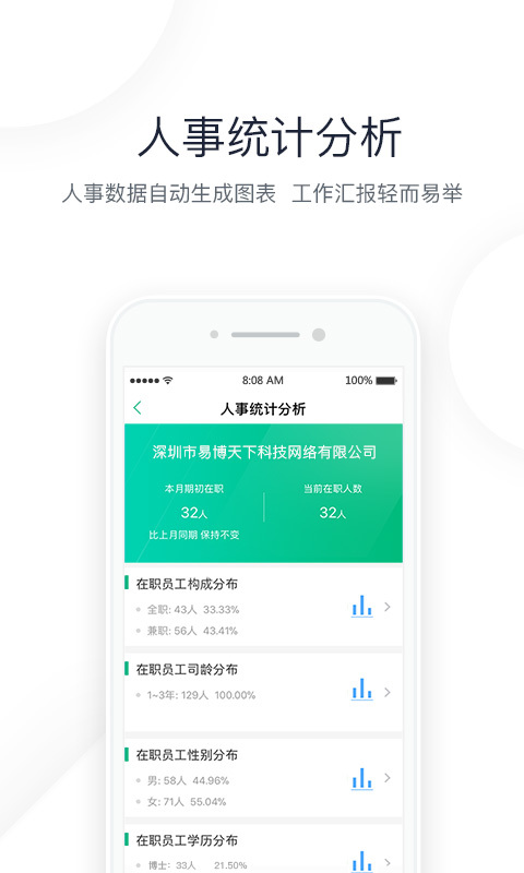 解决: 自动生成40多种精美的人事报表,一周的工作量5分钟搞定;一键获取薪酬分析、人力成本分析,实时掌握企业用工情况。