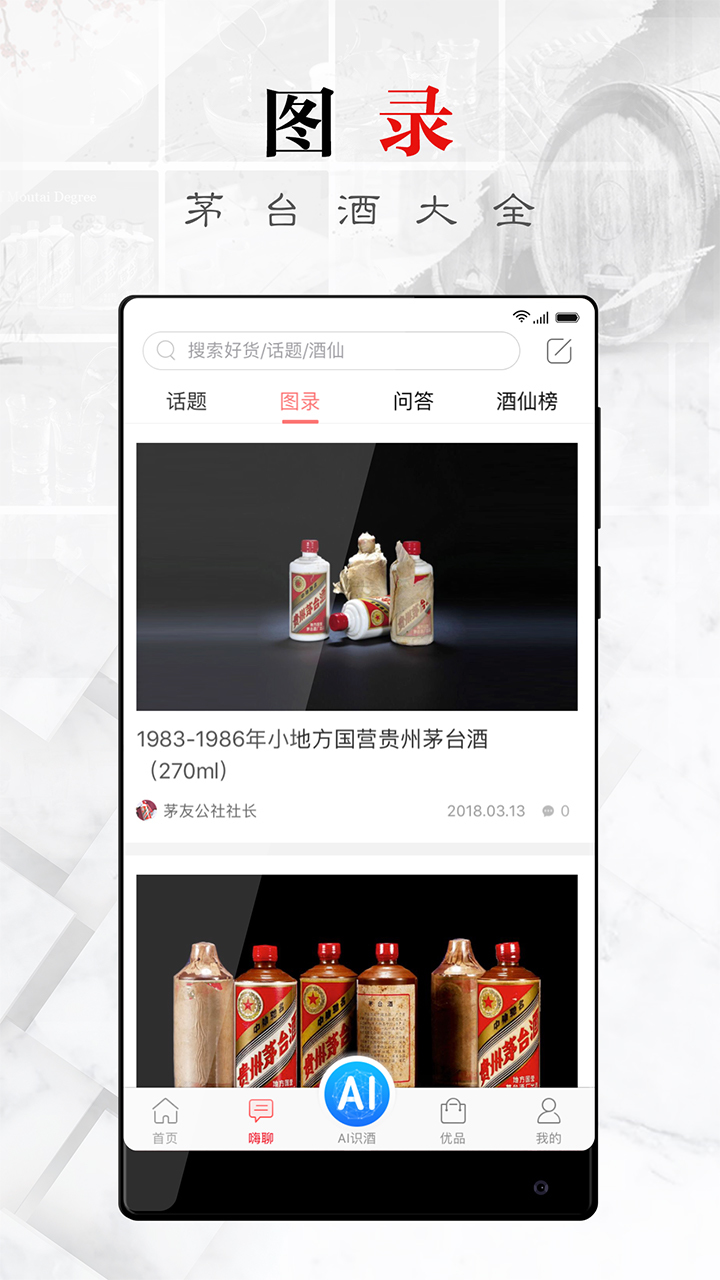 · 茅台酒资料库:茅友公社有着近千余款茅台酒信息的丰富资料库,为广大茅友提供广而细致的茅台酒专业知识讲解,为每位用户提供专业茅台酒知识补充。