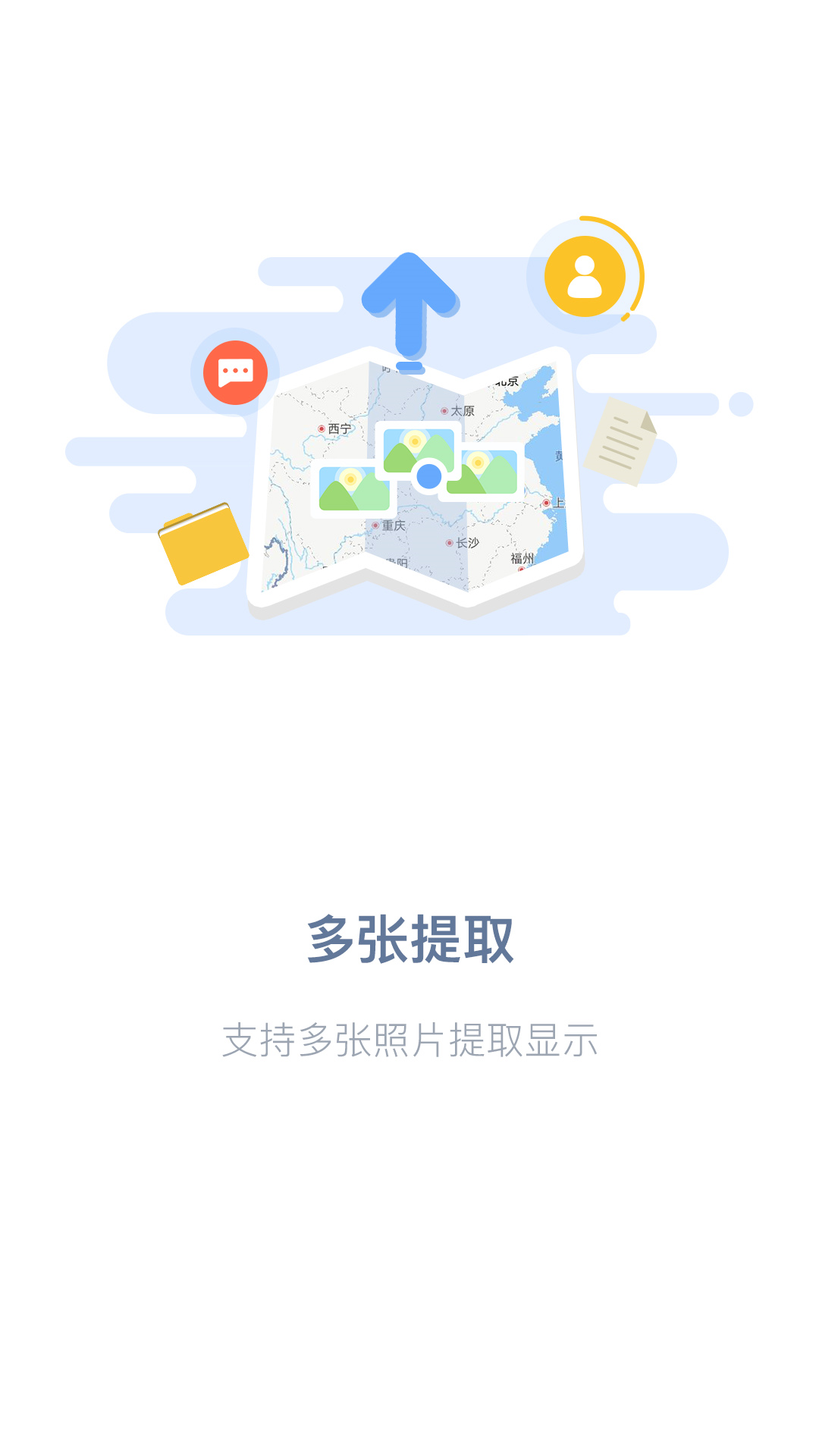 (2)提取:点击主界面“提取”按钮,选取使用本软件拍摄的照片(最多支持9张选取),可以从该照片中提取嵌入的信息,并显示在地图中对应的经纬度位置上。