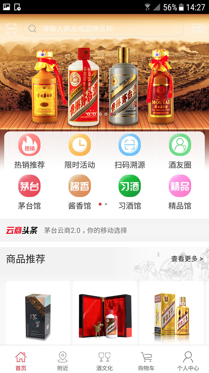 “茅台云商”是贵州茅台集团电子商务股份有限公司自主打造的集上游茅台集团各子公司资源,中游物流公司、线下专卖店(经销商),下游面对消费者的物联网云商交易。茅台云商APP集茅台产品销售、国酒文化、会员服务、粉丝经济、私人酒窖、溯源防伪、物流配送功能于一身。消费者足不出户就能通过移动终端在享受会员服务、领阅国酒文化、交流藏酒感悟的同时订购官方提供的放心产品!