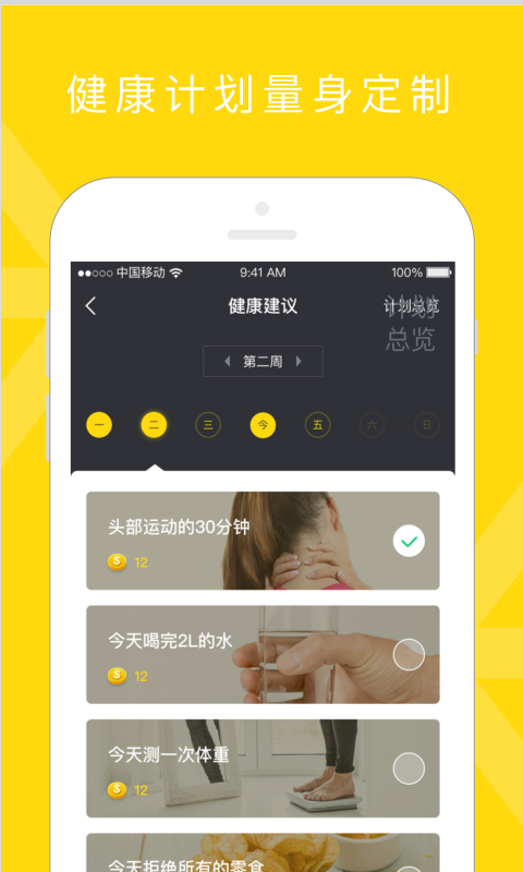 个性化解决方案,囊括三大类100%人群:患有糖尿病、高血压、高血糖等慢病人群;需要颈椎病康复、体重管理、失眠改善等亚健康人群;有减肥塑型,中医养生、强健体质等需求的健康人群。