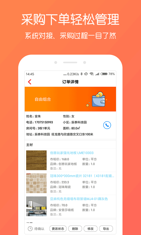 (装修公司下单功能)可实现一键下单,从测量预约到送货安装全过程一键操作,提高下单效率及准确性,更可实现材料供应的透明性。