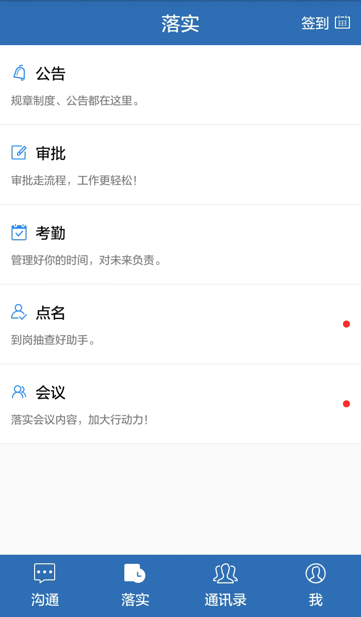 本APP是一款协同办公管理应用,具有如下功能 1.考勤管理,查看签到,每日每月统计迟到早退外出出差请假 。 2.任务管理 收发任务统计。 3.发送会议通知,公告通知,安排加班。 4.客户管理 客户跟进 签订合同 收款提醒。 5.审批管理 出差 请假 外出 事项审批,多级审批,自动审批。 6.及时通讯,群组管理。 7.点名抽查。