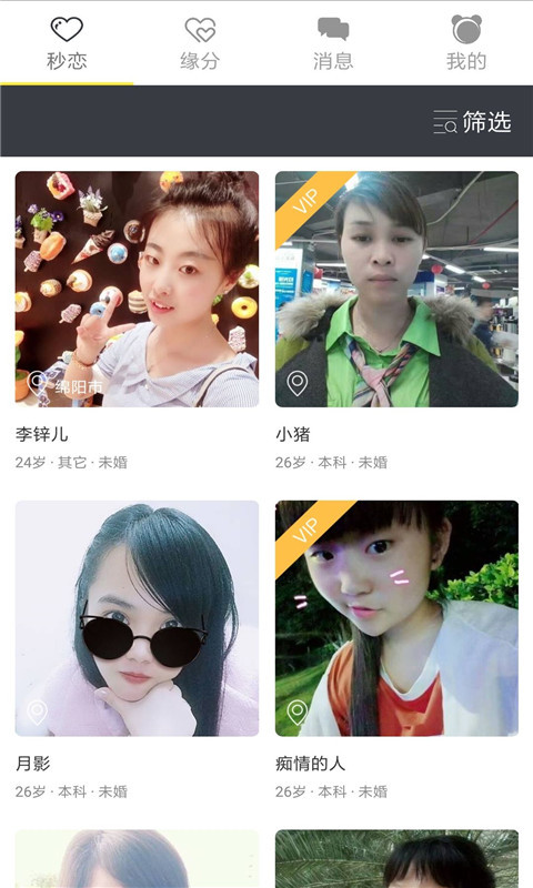 【筛选】为用户寻找身边的恋人,也就是同城婚恋相亲交友。这里您可以通过年龄,学历,收入,居住地、家乡等进行筛选。也许那个爱你的他(她)就在你身边。相亲交友可不要错过附近的人噢,缘分这个东西,有时候就是这么任性。