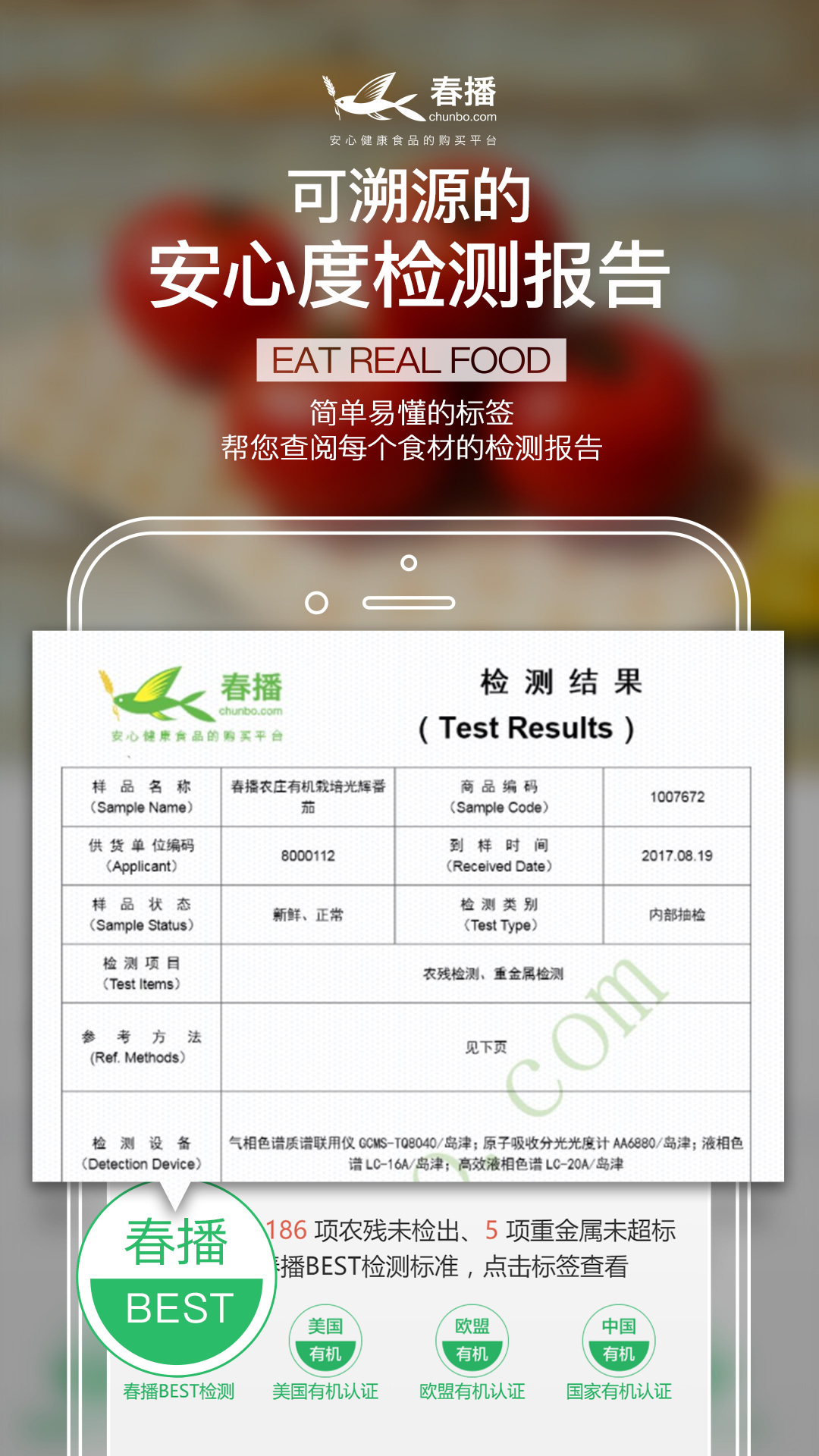 ?遵循“安心、新鲜、健康、美味”四大选品原则,春播实验室中配备总价值600万元的多台日本岛津精密检测仪及专业快检设备,由硕士、学士组成的专业质检团队负责对商品品质进行严格把控,并实时出具检测报告,只为您一份安心。?