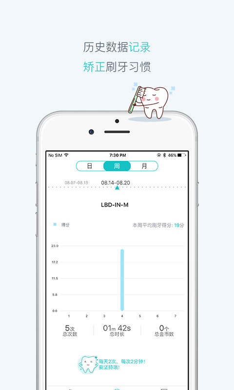 4、刷牙数据:通过每次同步数据可记录您的每次刷牙结果,您可以日、周、月的形式查看自己的历史数据。