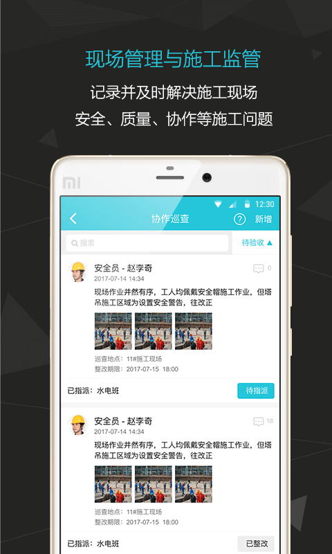 2、施工实时把控:由各施工班组按施工节点或周期提交施工情况,让您通过手机很方便的了解项目现场施工的全部情况,并且掌握一手施工资料。